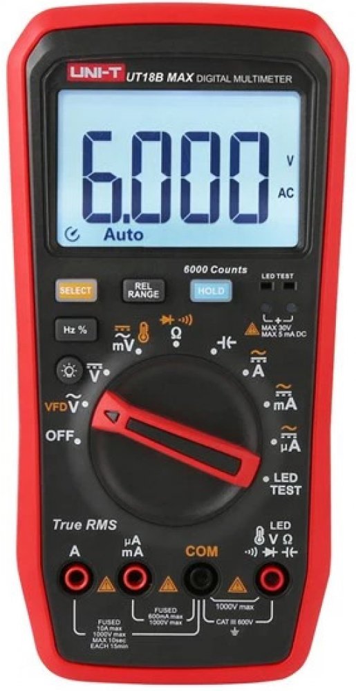 Digitální multimetry UT18B MAX je spolehlivý digitální multimetr typu True-RMS. Multimetr je navržen tak, aby odolával rušení, a dokáže odfiltrovat rušení od nosné frekvence překryté sinusovým signálem nebo signálem různého zkreslení napětí a je schopen měřit výstupní napětí pohonu s proměnnou frekvencí. V režimu stejnosměrného/ střídavého napětí může přístroj provádět měření frekvence a pracovního cyklu. UT18B MAX má funkci měření teploty s rozlišením 0,1 C. Funkce testování LED umožnuje UT18B MAX testovat LED s napětím až 12 V, aniž by bylo nutné určovat polaritu.