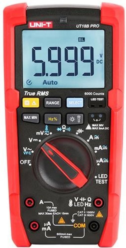 Přístroj UT18B PRO umožňuje měření AC/DC napětí a proudů, odporu, kapacity, kmitočtu, pracovního cyklu a teploty. Možnost používání i v prostředí s elektrickým polem až 1V/m.
