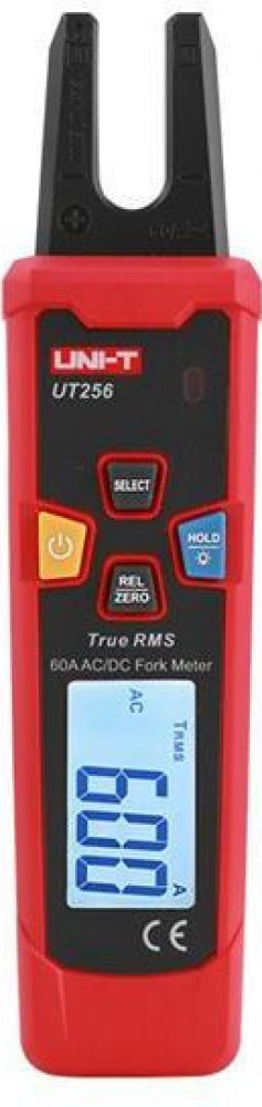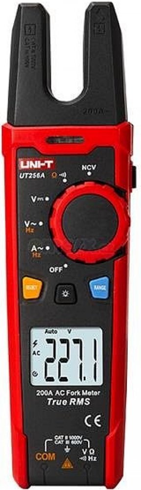 Digitální multimetr UT256A je bezpečný a spolehlivý vidlicový měřicí přístroj pro měření skutečných efektivních hodnot (RMS) napětí a proudů, který může nahradit klešťový multimetr. Nemá žádné mechanicky pohyblivé díly a z toho vyplývá jeho odolnost proti mechanickým poruchám. Přístroj má displej s maximální zobrazitelnou hodnotou 6000. Pomocí vidlice s Hallovou sondou umožňuje měření střídaveho proudu až do 200A. Pomocí přiložených měřících kabelů je dále možné měřit střídavé a stejnosměrné napětí, odpor, spojitost vodičů, má zabudovaný bezkontaktní snímač střídavého elektrického napětí (NCV) a zabudovanou svítilnu. Má funkce pozastavení dat, automatickou a manuální volbu rozsahu, podsvícený displej, měření frekvence, indikaci vybité baterie. Maximální průměr drátu, který lze vložit do vidlice je 15mm. Indikace překročení rozsahů červenou LED, u NCV akustickým signálem. Výhodou je odolnost proti pádu z výšky až 2m. Napájení dvěma bateriemi 1,5 V AA. Tyto vlastnosti činí z multimetru UT256A praktický přístroj pro každodenní práci silnoproudých elektrikářů.