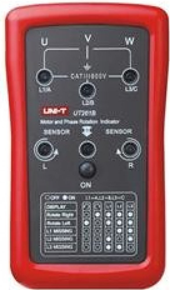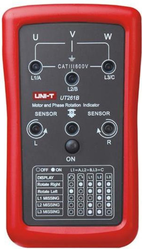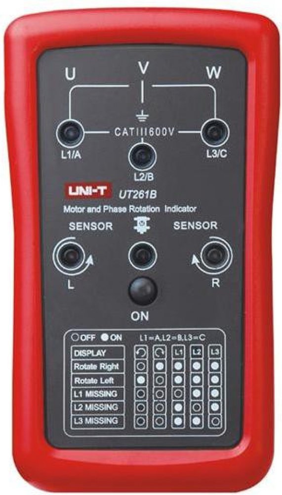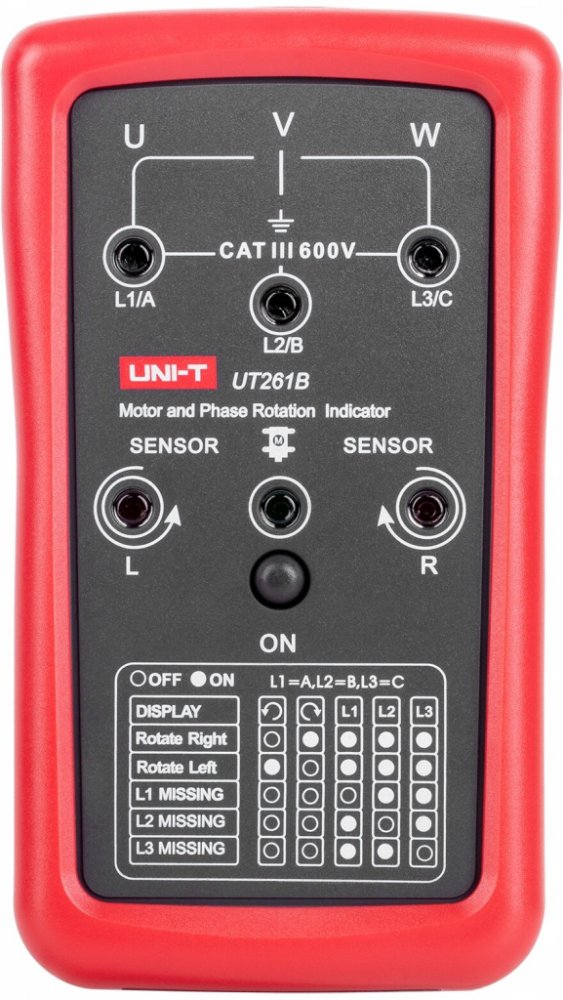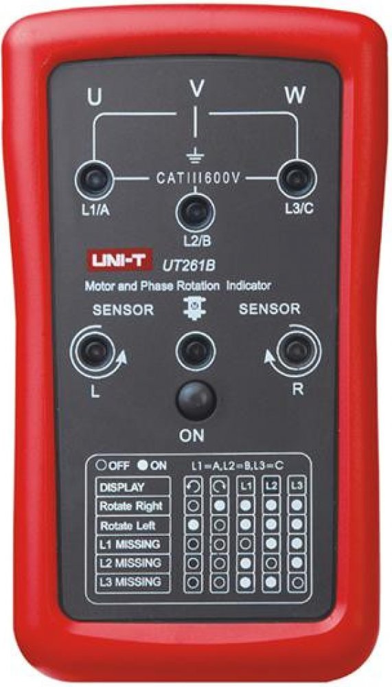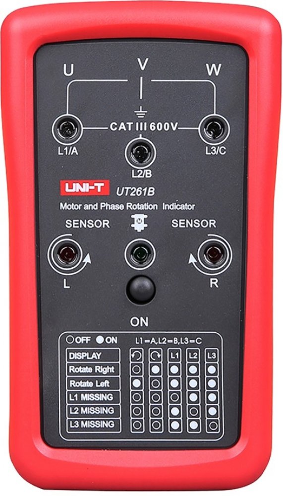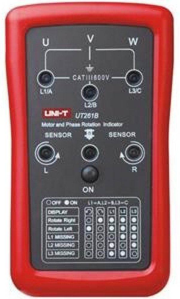 UT261B se používá k určení sledu fází, chybějící fáze a otáčení motoru. UT261B měří střídavé napětí 90 ~ 600V. Může pracovat v kmitočtovém pásmu od 15 ~ 400Hz. Je odolným zařízením, které vydrží náraz z výšky 2 metrů.