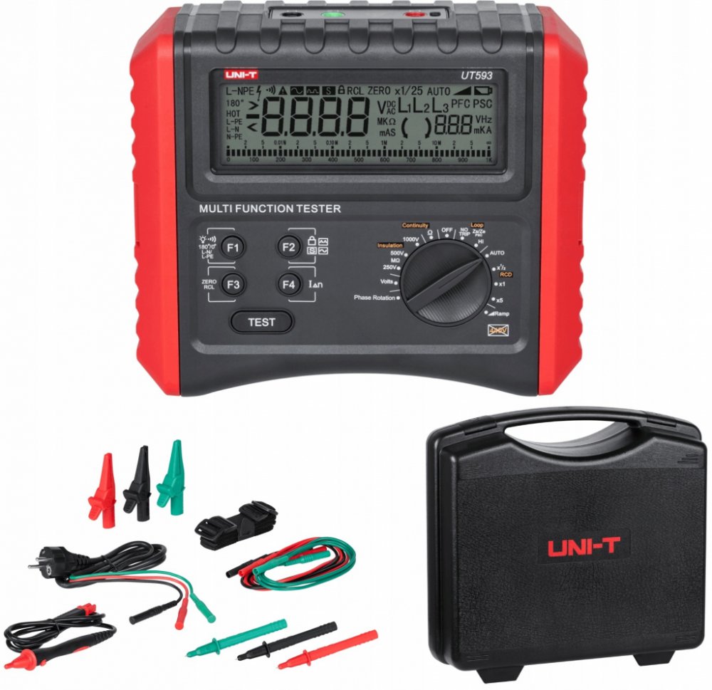 Zařízení je také komplexní tester bezpečnosti elektroinstalací. UT-593 umožňuje měření odporu izolace, impedance smyčky s/bez vypnutí jističů RCD, impedanci vedení, nenarušenost ochranných a vyrovnávacích kabelů, test proudu vypnutí a času spuštění jističů RCD, hodnoty napětí AC a zobrazování sledu fází.