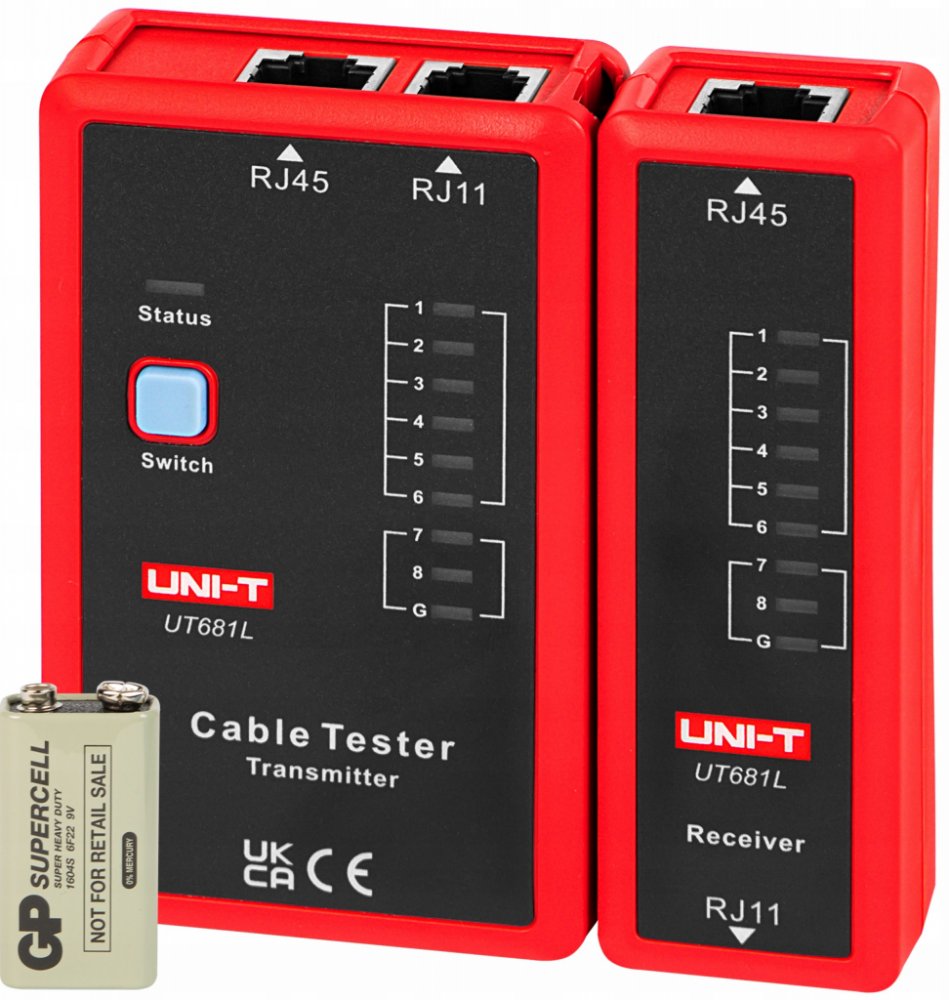 UT681L je navržen pro testování Ethernet kabelů (RJ45), telefonních kabelů (RJ11). Umí rychle detekovat zkraty na vedení, nesprávné zapojení a přerušené vedení. Přístroj je schopen rychle testovat a přesně určit stav každého jednotlivého vodiče ve vícežilových kabelech uvedených výše. Je skvělým pomocníkem při tvorbě a výstavbě komunikačních sítí a infrastruktury.