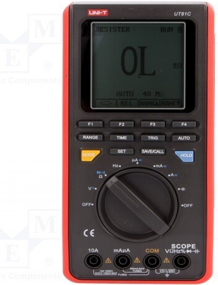 Ruční přístroje UT81C spojují digitální multimetr a osciloskop do jednoho ručního přístroje. Měření v osciloskopickém režimu zahrnuje vstup signálu, automatické měření a zpracování dat, ukládání křivek do vnitřní paměti (až 10 osciloskopických obrazovek, včetně nastavení) a možnost jejich přenosu do počítače. Šířka pásma osciloskopu je 16MHz při vzorkovací frekvenci v reálném čase 80MS/s. V režimu multimetru umožňuje měření stejnosměrných a střídavých napětí a proudů, dále odporu, frekvence, plnicího poměru, kapacit, diod, a spojitosti obvodů. Automatické nebo ruční přepínání rozsahů multimetru. Monochromatický displej s 32 stupni podsvícení a možnosti zobrazení hodnoty ±3999, 3 3/4 číslice. Jištění proudových okruhů rychlými pojistkami F0,5A/1000V, ø6 x 32mm a F10A/1000V, ø6 x 32mm. Přístroj může být napájený z vyměnitelných baterií R6 (1,5V). V dodávaném příslušenství je USB optoelektrický převodník s kabelem pro připojení k počítači. Je možné dokoupit osciloskopickou sondu s napěťovým děličem, případně BNC diagnostickou sondu a také napájecí AC adaptér.