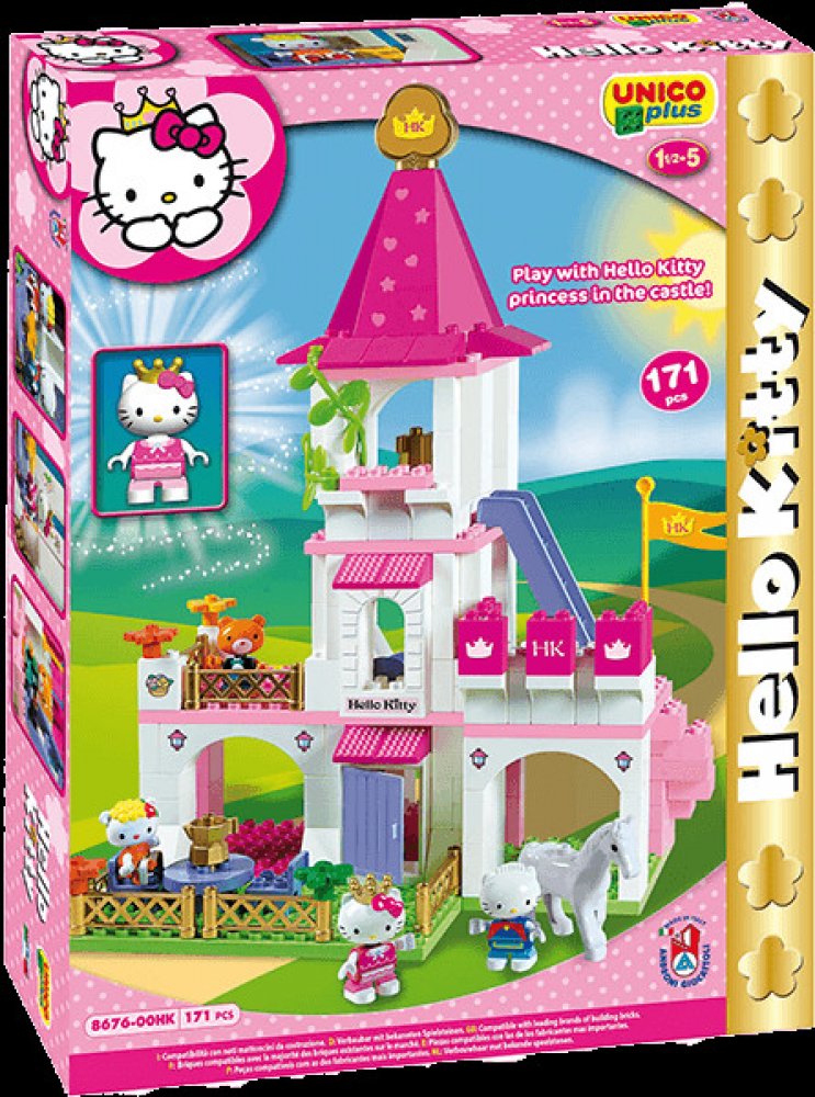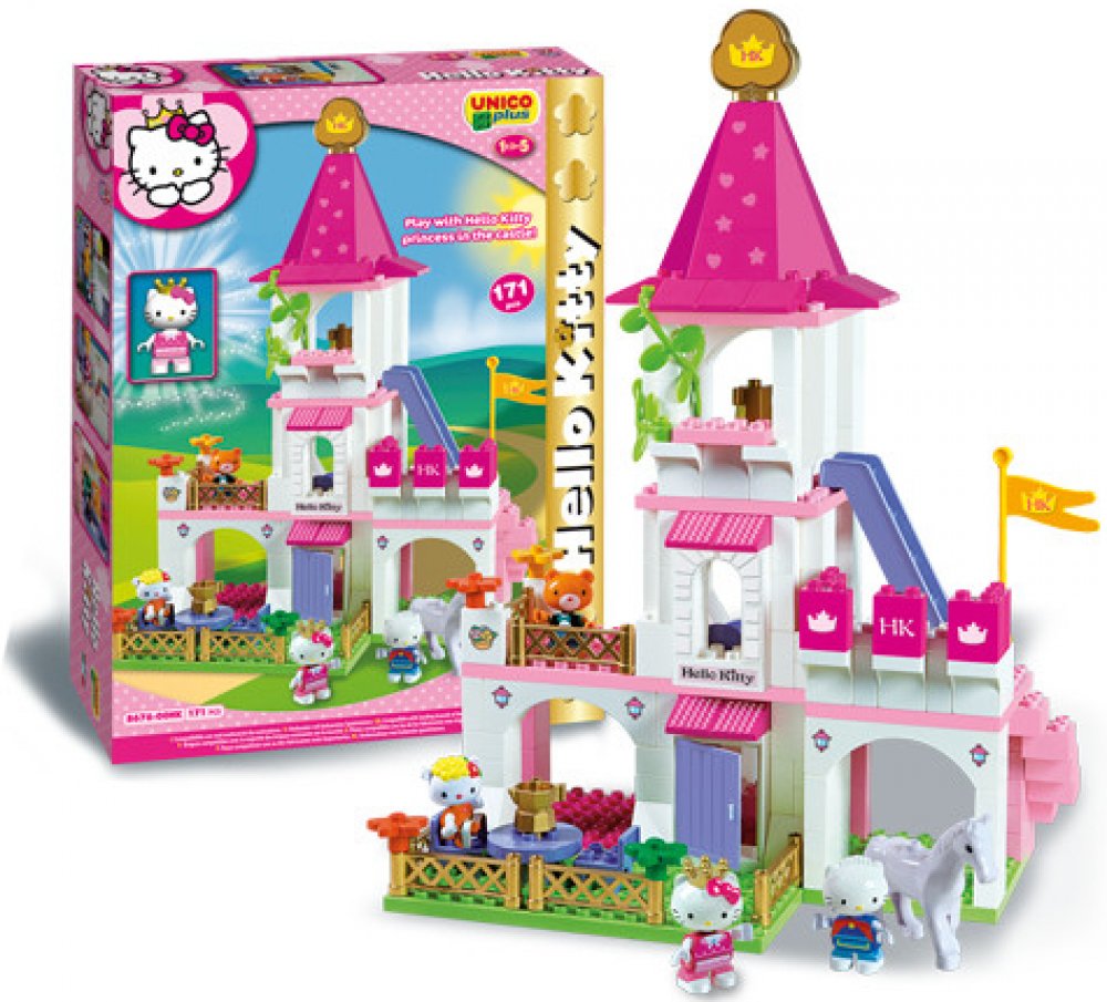 Stavebnice Hello Kitty + 5 figurek (typ LEGO DUPLO). Zámek pro Hello Kitty a kamarádky. 5 figurek - Hello Kitty, kamarádky a koník. Baleno v kvalitním kartonovém obalu s barevným potiskem, návod na sestavení součástí balení. Plně kompatibilní s dalšími stavebnicemi (LEGO DUPLO, MUBI apod.). Rozměry krabice (kartonového obalu) cca. 51x39x10cm. Nezávadný plast, certifikace CE, vyrobeno v Itálii. 171 dílků. Stavebnice UNICO PLUS pomáhají dětem rozvíjet kreativitu a představivost, učí je řešit problémy, trénují manuální schopnosti a jemnou motoriku. Lehce se skládají, jsou dodávány v estetických obalech, mají evropský atest i certifikaci. Jsou plně kompatibilní se všemi ostatními známými značkami stavebnic jako je LEGO DUPLO, MUBI a další.