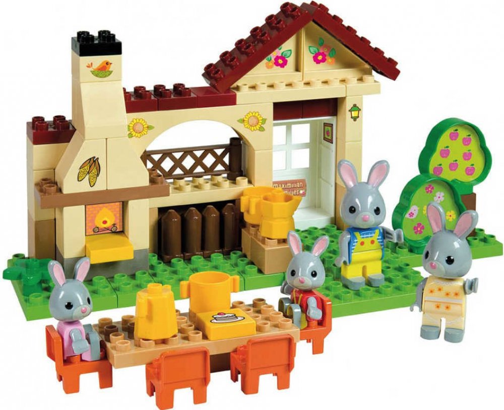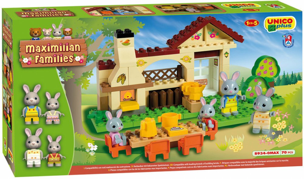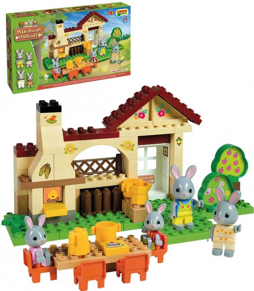 Unico Plus - barevná plastová stavebnice od Androni, z produktové řady Maximilian Families, vhodná i pro nejmenší děti, které si z ní mohou sestavit model venkovního posezení s grilem a zvířátky. Součástí