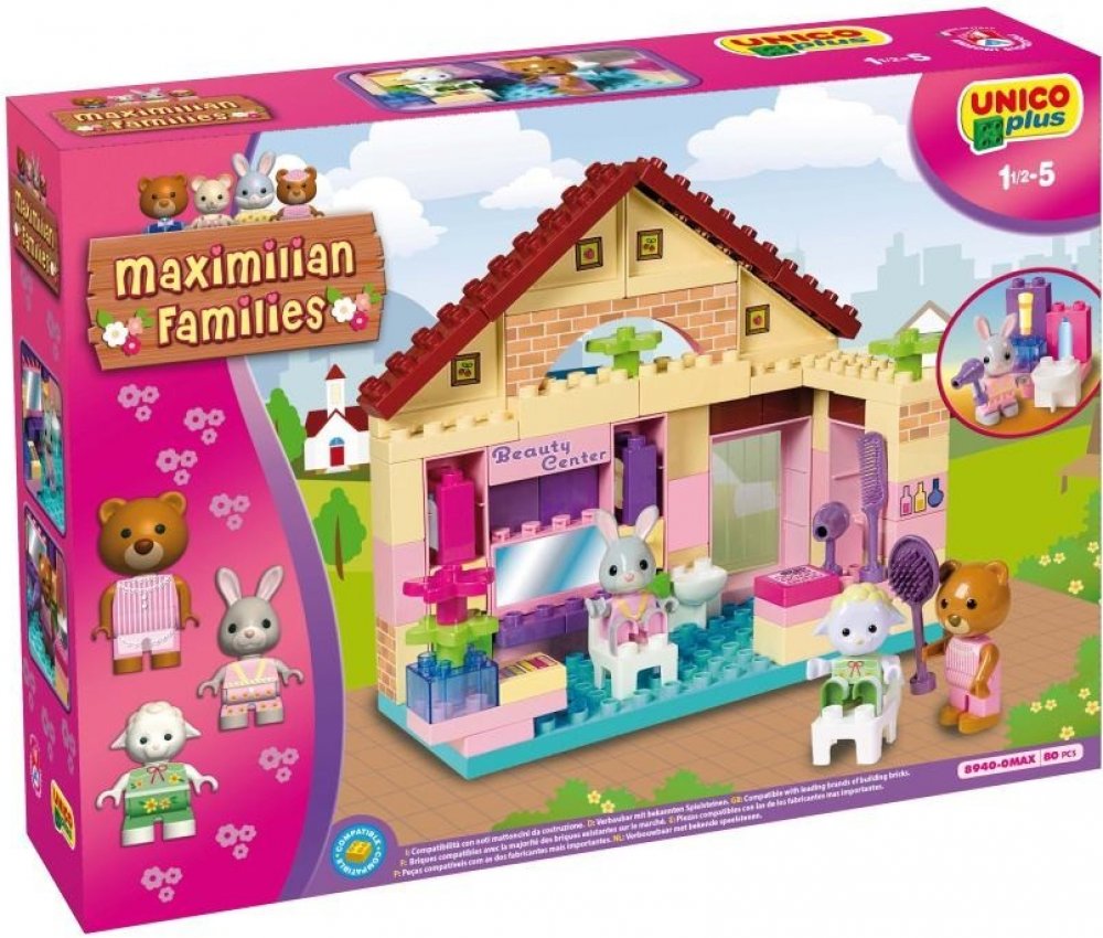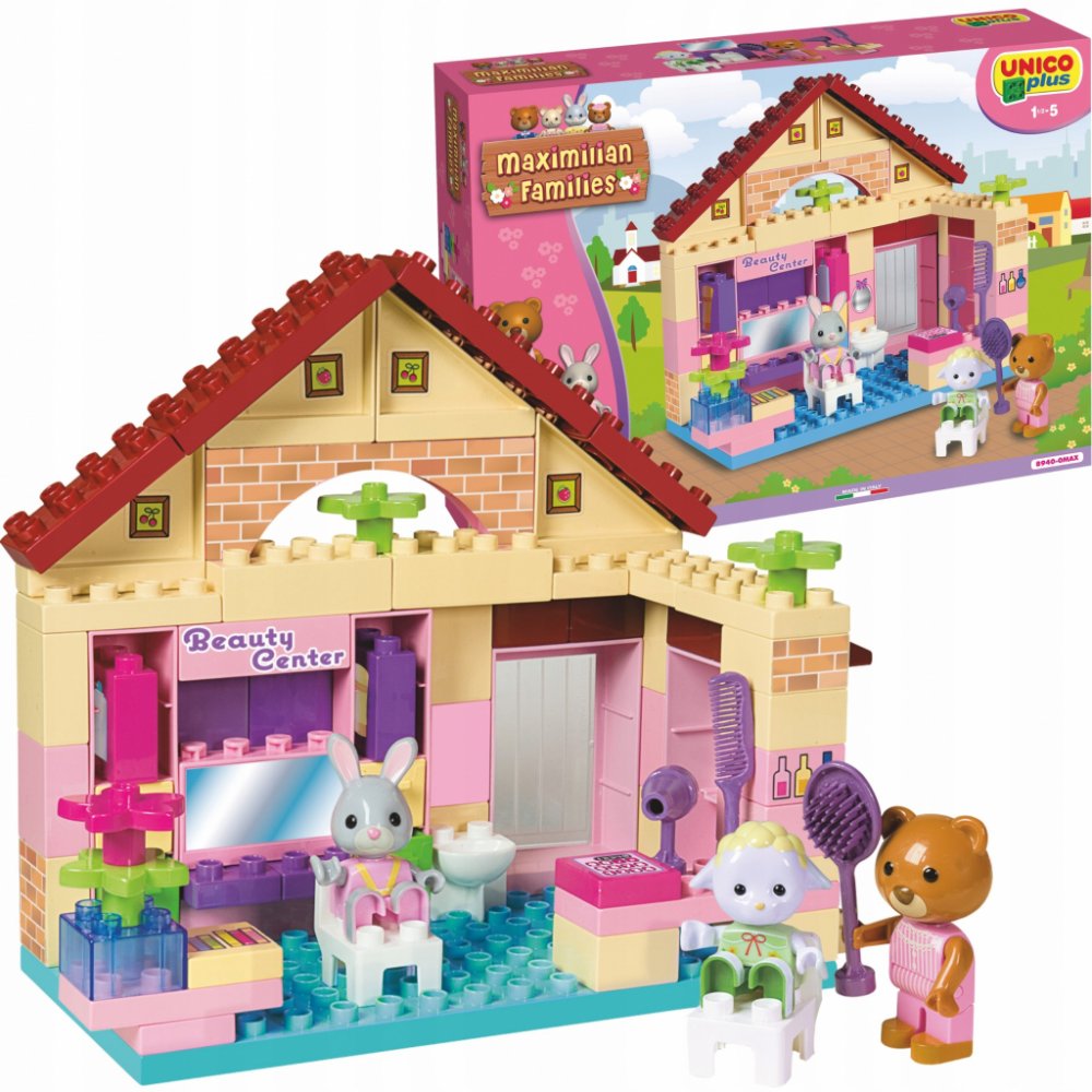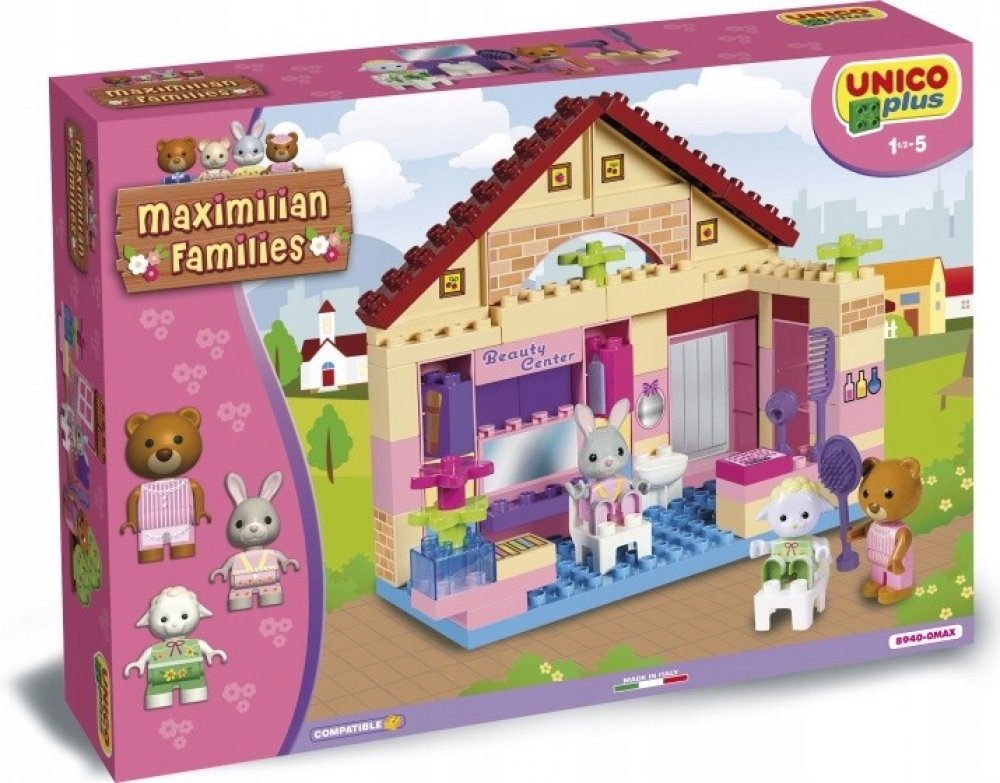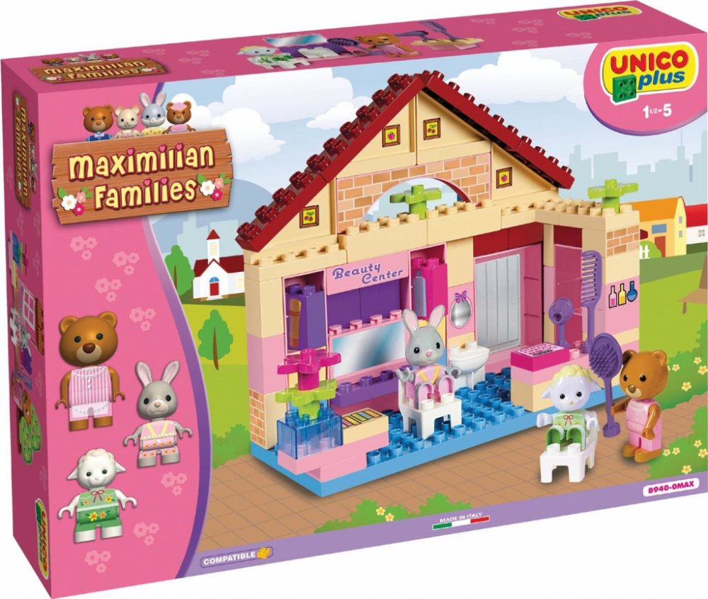 Stavebnice Maximilian Families (zajíčci a medvídci) + figurky (LEGO DUPLO kompatibilní). Salon krásy s příslušenstvím + 3 figurky. Baleno v kvalitním kartonovém obalu s barevným potiskem, návod na sestavení součástí balení. Plně kompatibilní s dalšími stavebnicemi (LEGO DUPLO, MUBI apod.). Rozměry krabice (kartonového obalu) cca. 46x33x9cm. Nezávadný plast, certifikace CE, vyrobeno v Itálii. 80 dílků. Stavebnice UNICO PLUS pomáhají dětem rozvíjet kreativitu a představivost, učí je řešit problémy, trénují manuální schopnosti a jemnou motoriku. Lehce se skládají, jsou dodávány v estetických obalech, mají evropský atest i certifikaci. Jsou plně kompatibilní se všemi ostatními známými značkami stavebnic jako je LEGO DUPLO, MUBI a další.