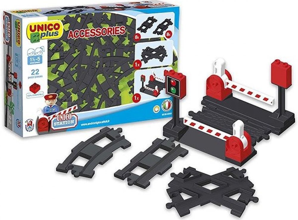 Sada obsahuje rovné i zakřivené koleje, schodový most a železniční přejezd se závorami a semaforem, což přináší realistické herní scénáře a ještě více zábavy při hře s vláčky. Všechny prvky jsou vyrobeny v Itálii z netoxických materiálů a splňují přísné bezpečnostní normy, takže jsou ideální i pro nejmenší děti.
