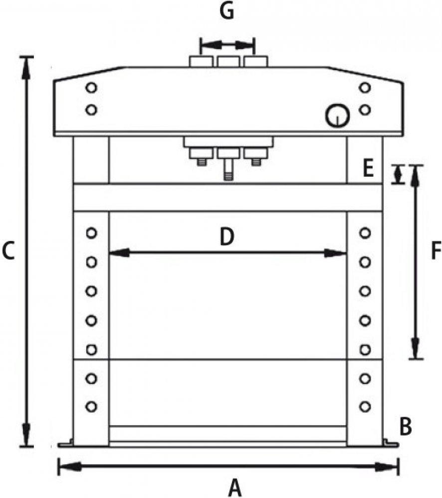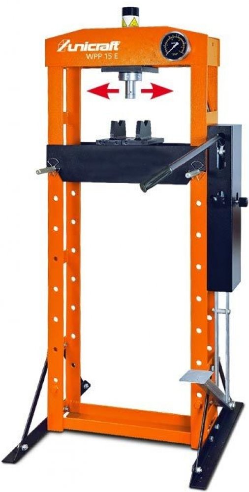 Hydraulický lis s robustním svařovaným rámem s osmi polohami výškového nastavení.