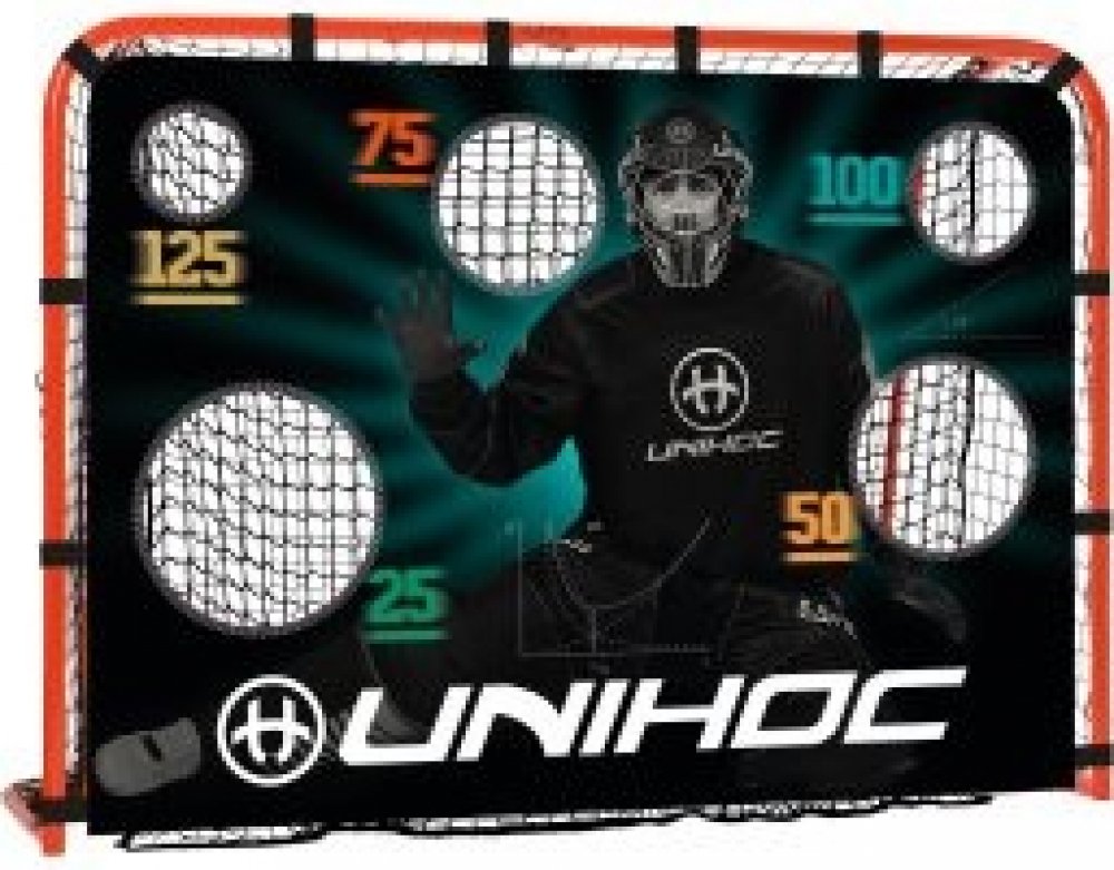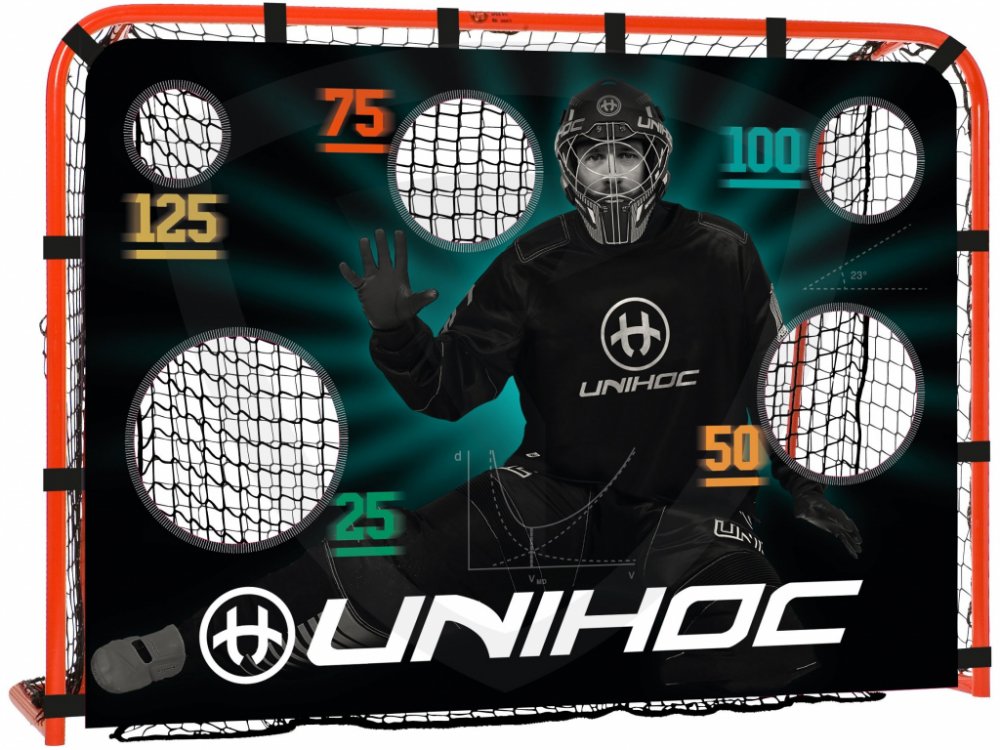 Unihoc Ball Buste je plachta s několika různě velkými otvory, které jsou umístěné v místech, kam gólman snadno nedosáhne. Napíná se do brány pomocí suchých pásků a slouží pro nácvik přesnosti střelby. Pasuje do klasické velké florbalové branky. Rozměry: 115x160cm/90x120cm