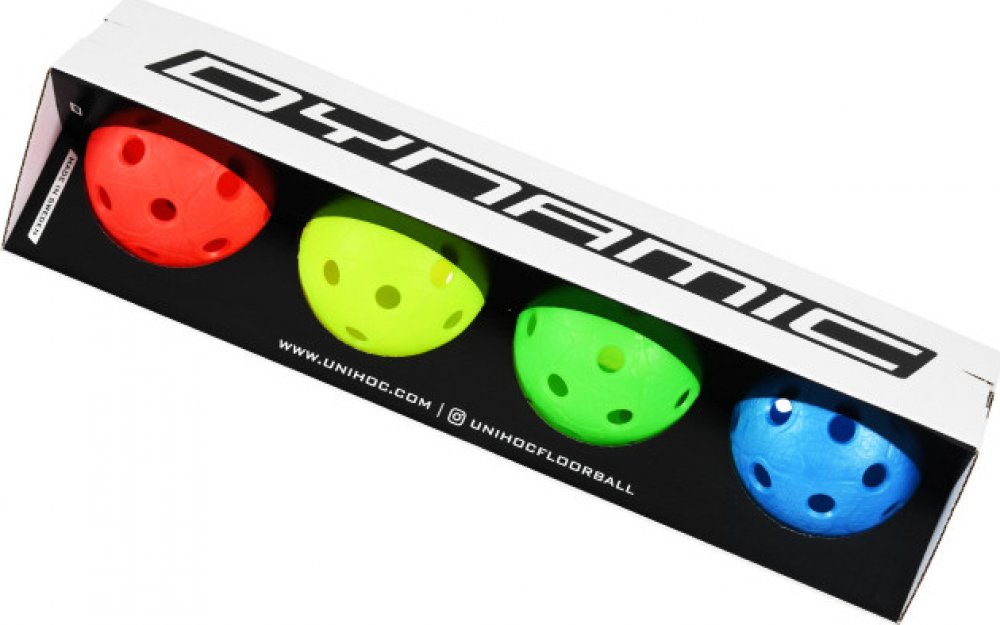 Unihoc Ball DYNAMIC 4ks-pack barevný Florbalový míček Unihoc DYNAMIC je novou generací florbalového míčku od značky Unihoc. Jeho design přispívá k optimálnímu zklidnění míčku v letové fázi a špičkové rotaci po hracím povrchu. Vnitřní konstrukce míčky byla zpevněna speciálními vzpěrami, čímž se zvýšila jeho tuhost a trvanlivost. DYNAMIC je díky tomu míčkem se špičkovými herními vlastnostmi. Výroba ...