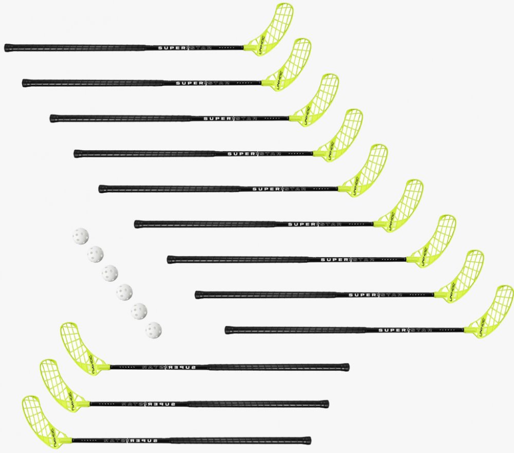 Set Unihoc Superstar 30 obsahuje 12 certifikovaných hokejek (9 levých a 3 pravé) + 6 míčků Unihoc Crater. Je možné s nimi hrát oficiální zápasy. Čepel na obrázku je pouze ilustrativní. Set má mix čepelí Unihoc Unity a Iconic. Odolnější kompozitní materiál, základní omotávka a tvrdost hole 30 mm – ideální pro začínající nebo lehce pokročilé hráče. V nabídce jsou ve velikosti 87 nebo 100 cm.