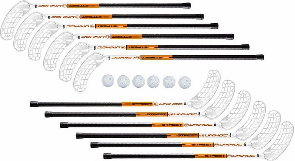 Sada florbalových holí Unihoc Set Street 35 obsahuje 12 hokejek a 6 míčků. Jedná se o základní hokejky s omotávkou a rovnou čepelí, kterou můžete zahnout na požadovanou stranu. Proto je tato sada vhodná zejména pro školy a sportovní kroužky. • Čepel:Oboustranná