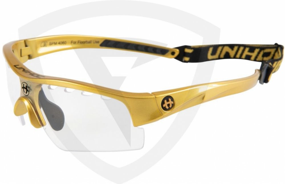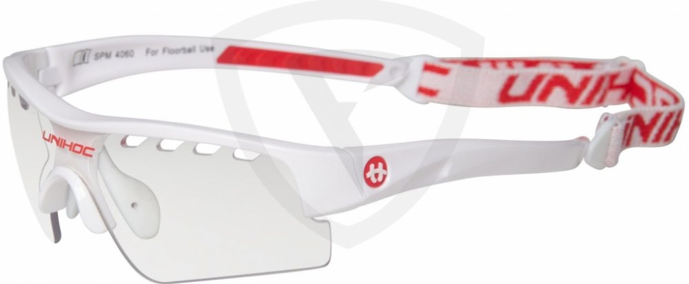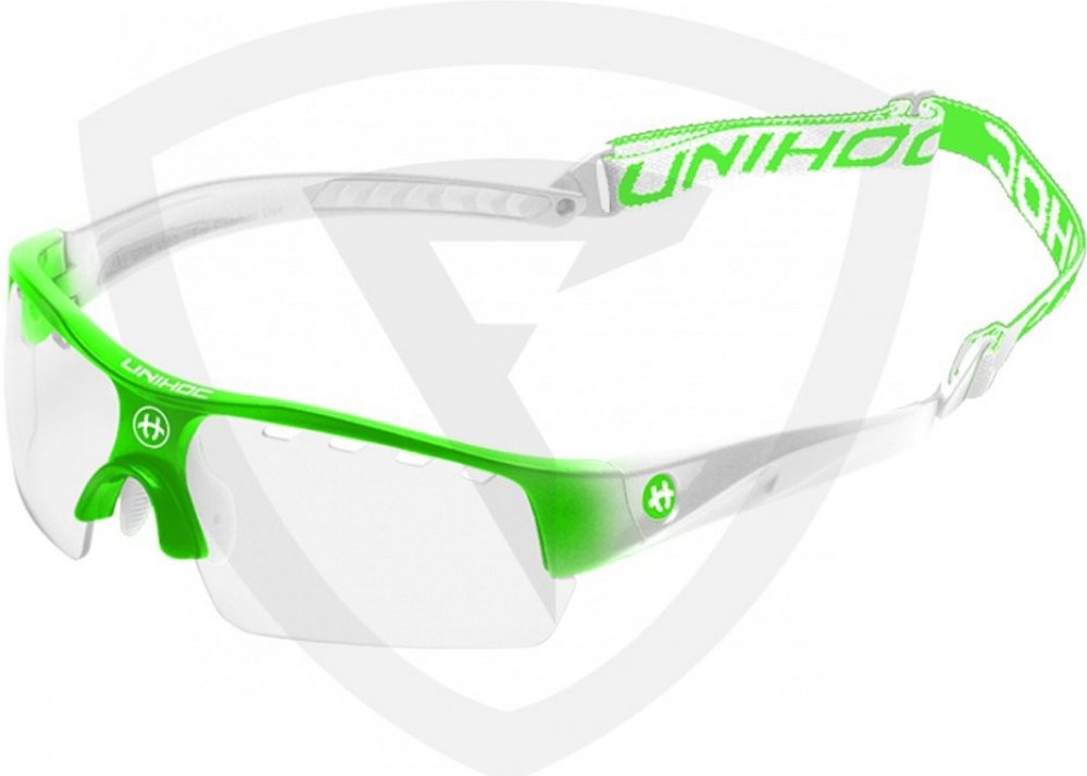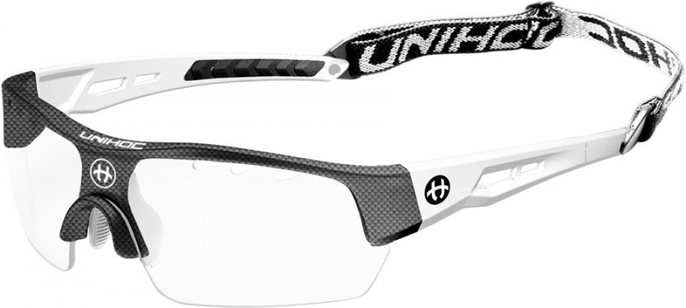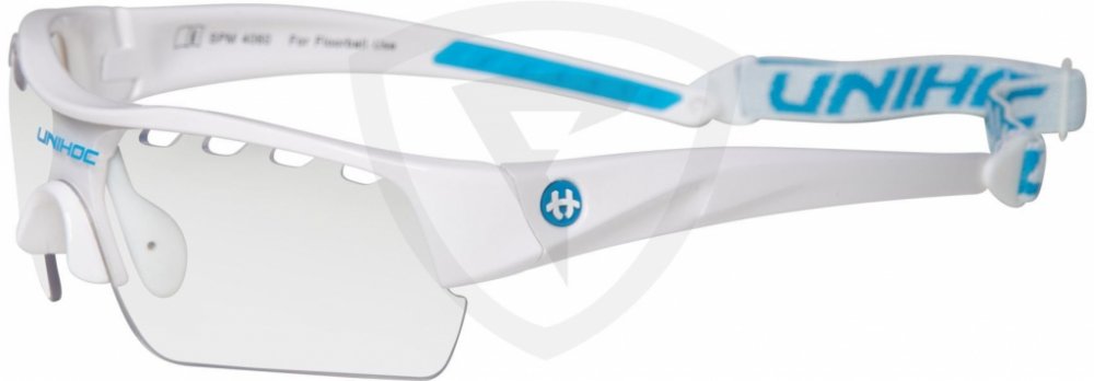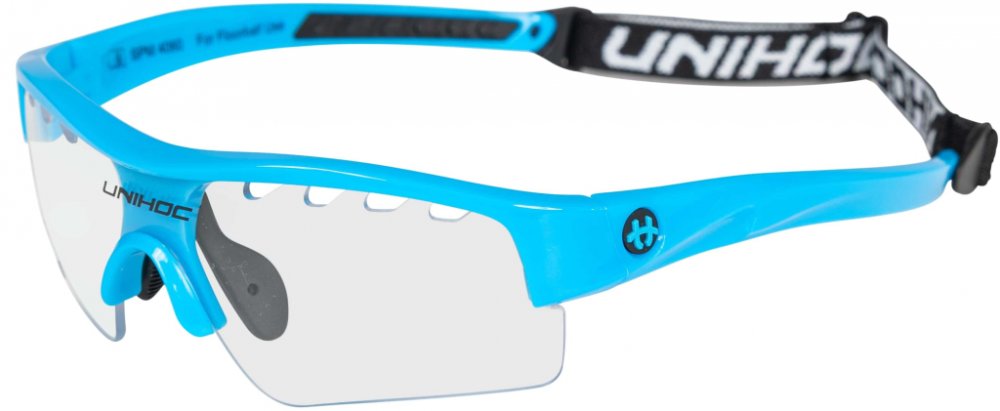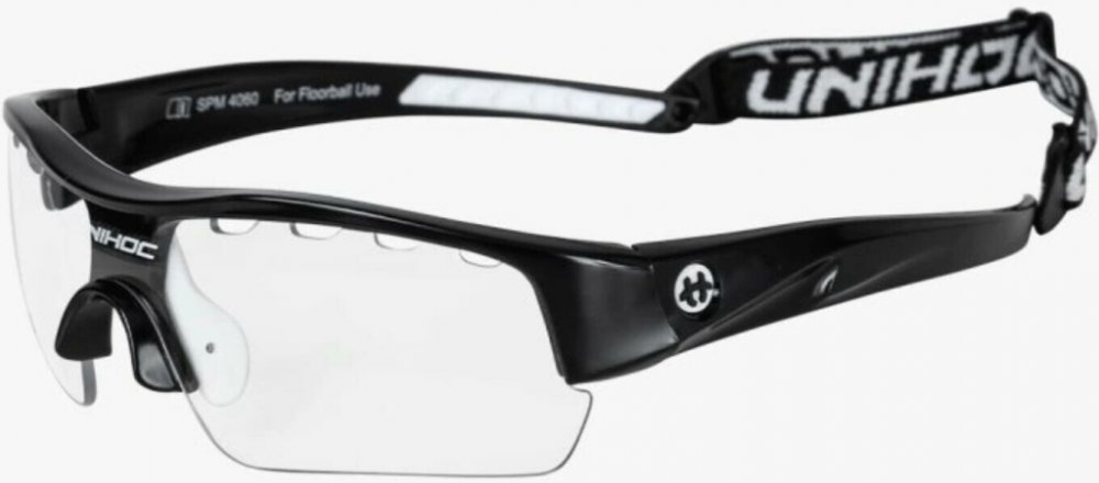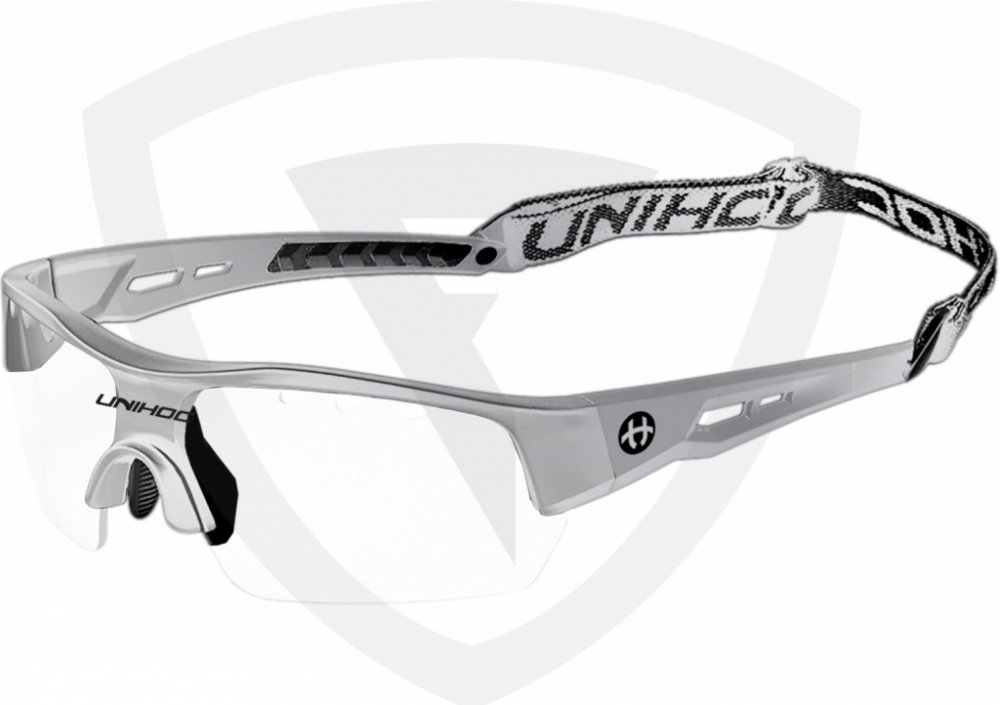 Unihoc Victory senior Florbalové brýle Victory Unihoc jsou stylové brýle s IFF certifikací. Unihoc Victory mají poloviční okraj, tj. čočky nemají ve spodní části oblouk, který by ti překážel ve hře. Nožičky jsou zakřivené z tvrdého plastu, aby kopíroval tvar Tvojí hlavy. Ve středu je úklona dolů, aby převzala podporu vašeho nosu. Na vnitřní straně je gumový nosník připevněn dvěma šrouby. Čočka na Unihoc Victory je čirá a vyrobená z polykarbonátu, což je forma nerozbitného plastu, který se často používá v oknech letadel. V okraji čočky je celkem osm kusů ventilačních otvorů, čtyři na každé straně nosu. Vpředu, přímo nad nosem, je na čočce vytištěno logo Unihocs. Nožičky jsou asi 11 cm dlouhá a také z tvrdého plastu. Na vnitřní straně je v zadní části gumy vybrání, aby brýle byly pohodlnější. Unihoc Victory má předmontovaný popruh kolem hlavy. Popruh je široký 1 cm, elastický a má protkané logo Unihocs. Popruh lze sundat. Unihoc Victory je označen CE v souladu s normami EU pro osobní ochranné prostředky. Brýle jsou také schváleny SP, švédský Provningsanstallt, IFF i Mezinárodní florbalové federace. Brýle jsou dodávány v tvrdém pouzdře, které slouží jako ochranné pouzdro, když se nepoužívají. Brýle mají nemlžící skla s UV 400. Klíčové vlastnosti: nerozbitná a nemlžící se skla přizpůsobitelný tvar nastavitelná velikost zadního pásku doporučované IFF skla s UV 400 Materiál: Stranice – lehký a ohebný TR90