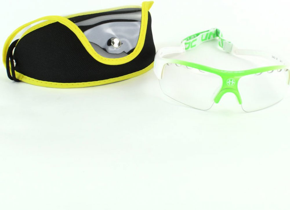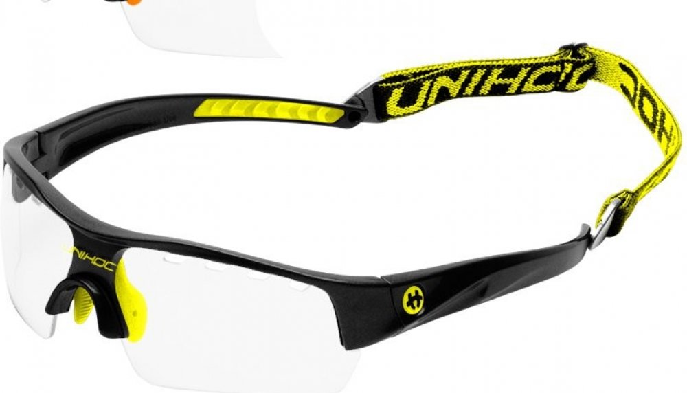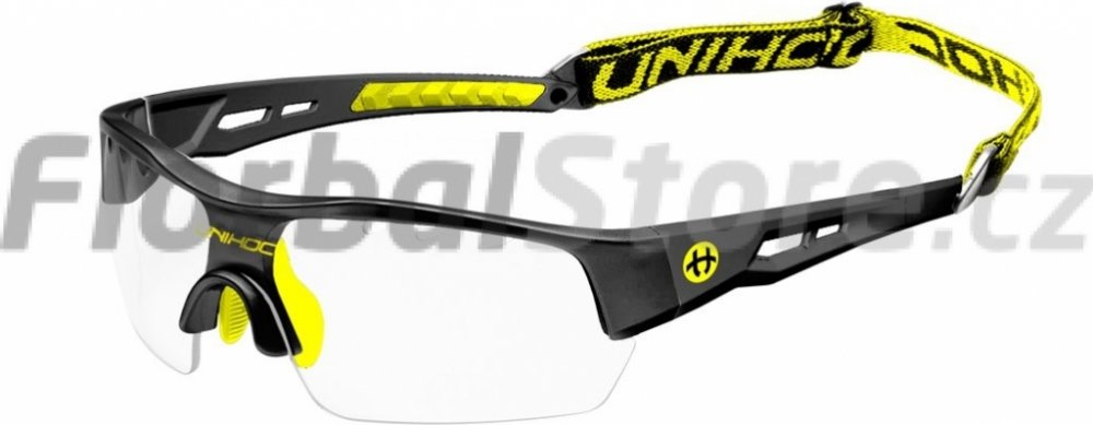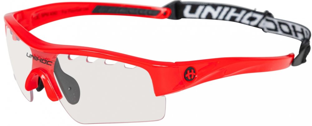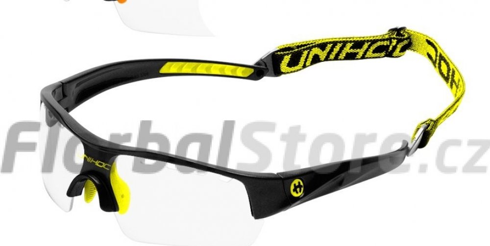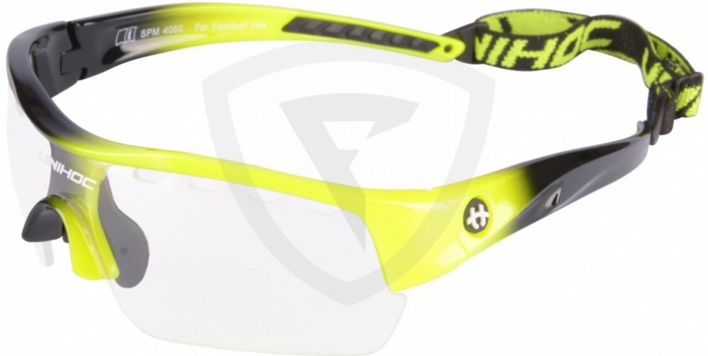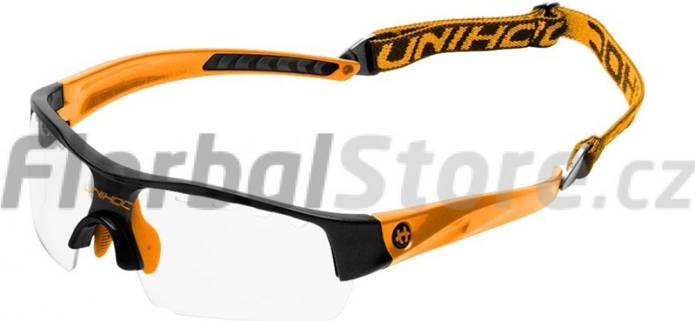 Unihoc Victory senior Florbalové brýle Victory Unihoc jsou stylové brýle s IFF certifikací. Unihoc Victory mají poloviční okraj, tj. čočky nemají ve spodní části oblouk, který by ti překážel ve hře. Nožičky jsou zakřivené z tvrdého plastu, aby kopíroval tvar Tvojí hlavy. Ve středu je úklona dolů, aby převzala podporu vašeho nosu. Na vnitřní straně je gumový nosník připevněn dvěma šrouby. Čočka na Unihoc Victory je čirá a vyrobená z polykarbonátu, což je forma nerozbitného plastu, který se často používá v oknech letadel. V okraji čočky je celkem osm kusů ventilačních otvorů, čtyři na každé straně nosu. Vpředu, přímo nad nosem, je na čočce vytištěno logo Unihocs. Nožičky jsou asi 11 cm dlouhá a také z tvrdého plastu. Na vnitřní straně je v zadní části gumy vybrání, aby brýle byly pohodlnější. Unihoc Victory má předmontovaný popruh kolem hlavy. Popruh je široký 1 cm, elastický a má protkané logo Unihocs. Popruh lze sundat. Unihoc Victory je označen CE v souladu s normami EU pro osobní ochranné prostředky. Brýle jsou také schváleny SP, švédský Provningsanstallt, IFF i Mezinárodní florbalové federace. Brýle jsou dodávány v tvrdém pouzdře, které slouží jako ochranné pouzdro, když se nepoužívají. Brýle mají nemlžící skla s UV 400. Klíčové vlastnosti: nerozbitná a nemlžící se skla přizpůsobitelný tvar nastavitelná velikost zadního pásku doporučované IFF skla s UV 400 Materiál: Stranice – lehký a ohebný TR90