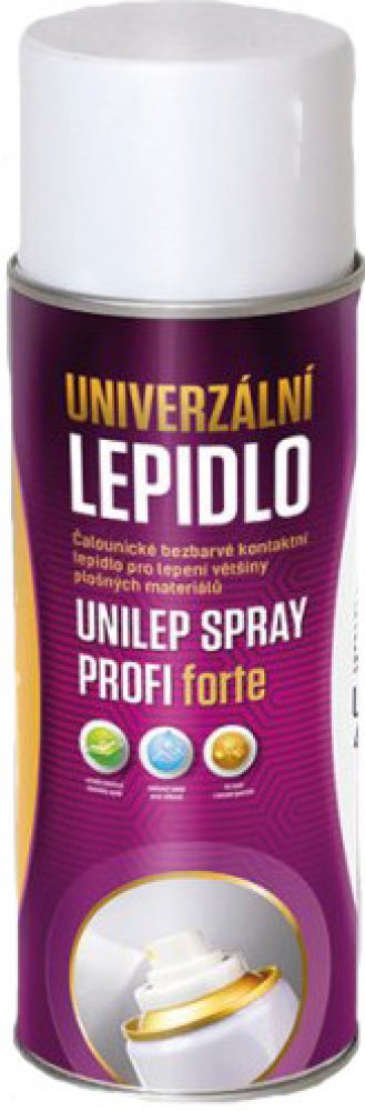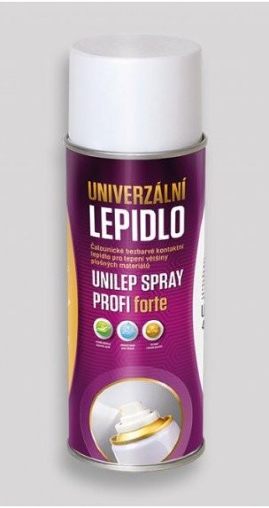 Stříkatelné kontaktní lepidlo v aerosolovém balení - spray. Lepidlo určené pro kontaktní lepení většiny plošných materiálů (textilie, dřevo, kovy, plasty, izolační hmoty, papír, pěnové materiály apod.). Lepidlo není vyvinuto pro lepení PVC koženky a výrobků obsahující migrující změkčovadla. Suchý film lepidla je elastický a vodovzdorný. Vhodné pro aranžérské a opravárenské práce a také nenáročné o...