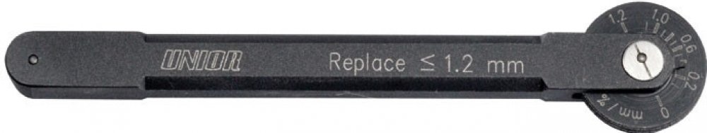 Unior profi měrka řetězu Unior profi měrka řetězu Jak použít nástroj Pro zlepšení pohybu řetězu a nerovnoměrného opotřebení hnacích dílů doporučuje většina výrobců výměnu řetězu v okamžiku nebo před okamžikem, kdy dojde k 0,6% natažení řetězu. Nyní můžete rychle a přesně stanovit hodnotu opotřebení a protažení jakéhokoliv řetězu. Jednoduše vložte kolíky nástroje pro kontrolu řetězu do dvou článků řetězu, zatlačte na rameno měřidla a poté odečtěte z okénka měřidla přesnou hodnotu. Pro zmenšení dopadů špatného pohybu a nerovnoměrného opotřebení pohonu doporučuje většina výrobců výměnu řetězu.