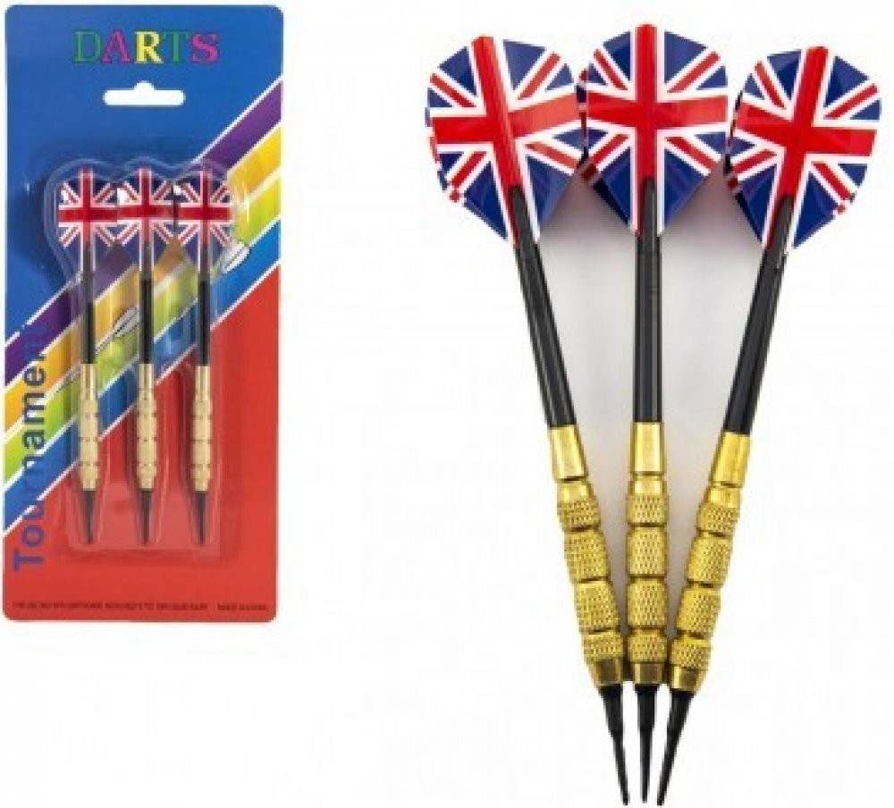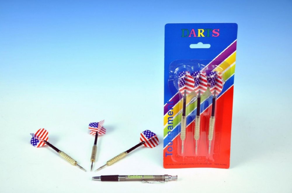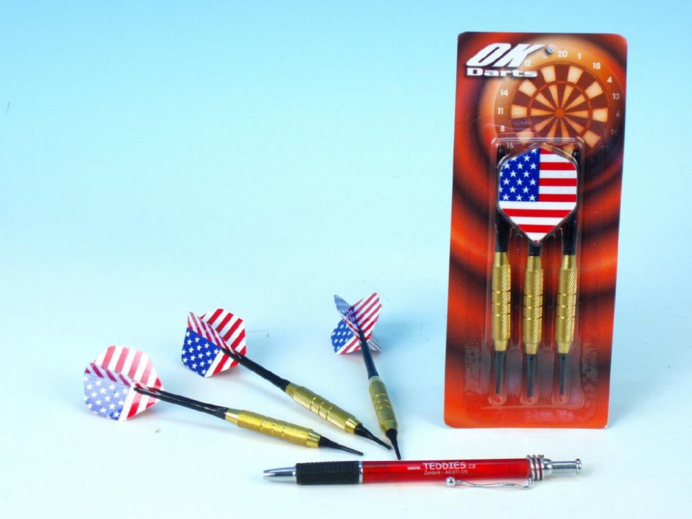 Sada házecích šípek s motivem vlajky USA. Házecí šipky jsou s vyměnitelnou násadkou a letkami a mají kovové hroty.Vhodné od 3 let.