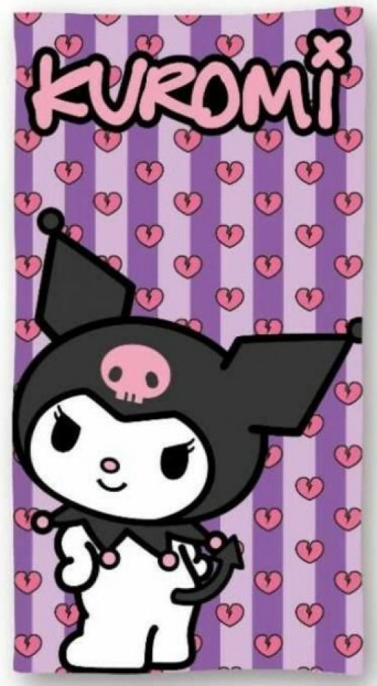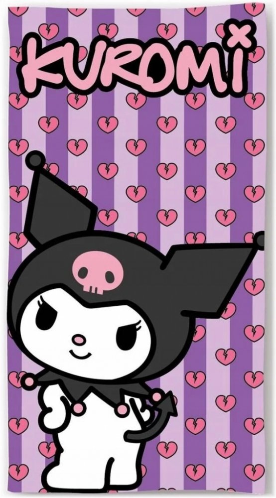 Dívčí osuška s motivem trochu drzé, ale zábavné a sympatické postavičky Kuromi a fialovým vzorem se zlomenými srdíčky. Vyrobena ze 100% bavlny s gramáží 290 gr./m², rozměr 70 × 140 cm. Ideální k vodě i do koupelny.