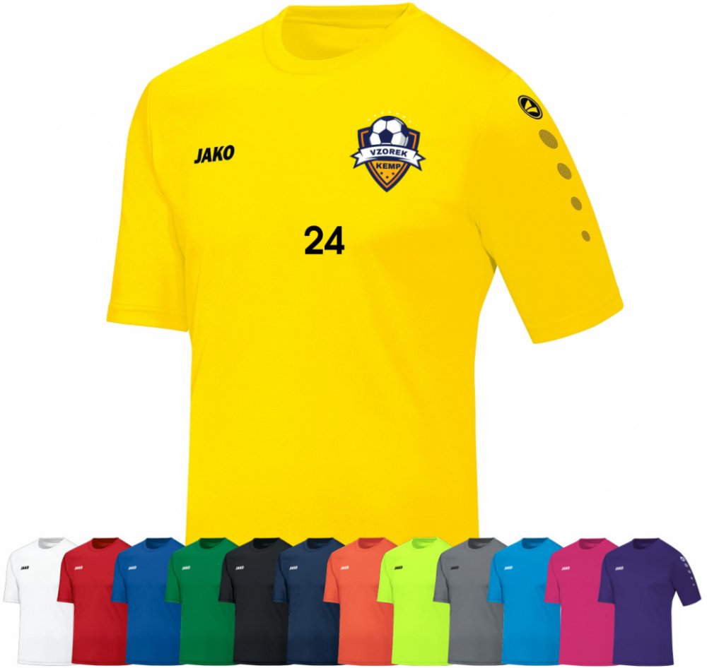 Fotbalový dres JAKO Team s krátkým rukávem. V ceně je potisk loga kempu, malého čísla nebo iniciálů na prsa a loga SportFotbal na rukáv nebo za krk. Zvolenou barvu a detaily k potisku napište do poznámky k objednávce nebo pošlete emailem na adresu info@sportfotbal.cz.