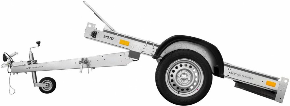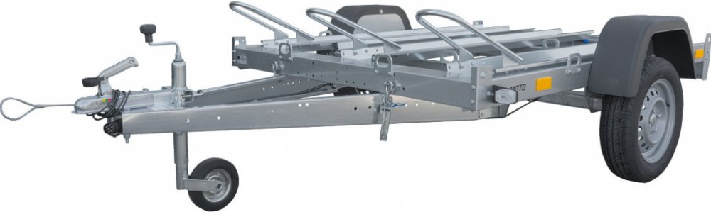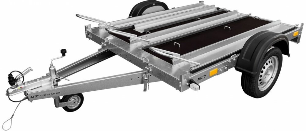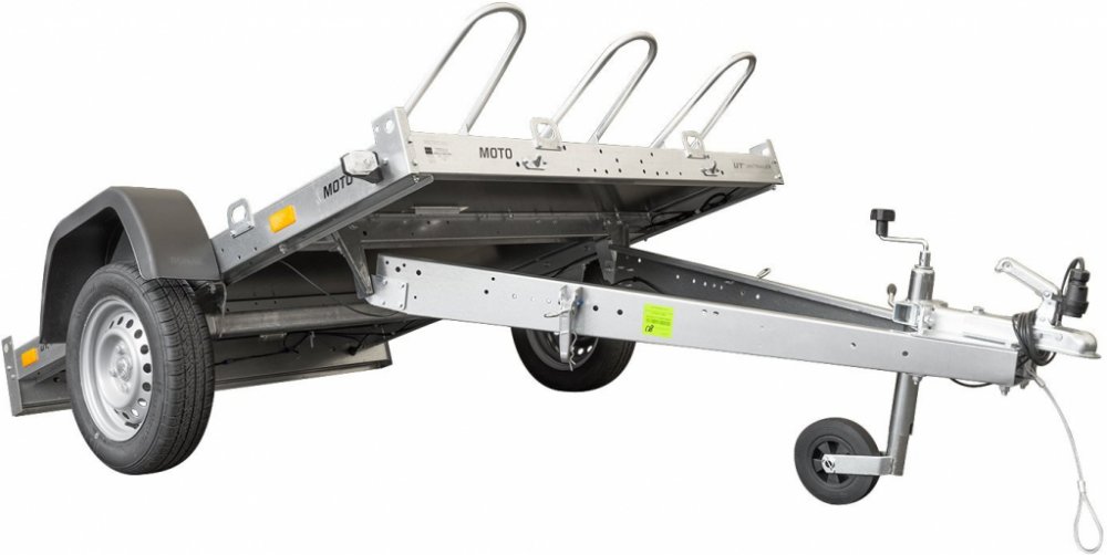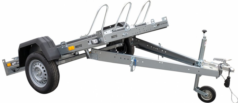 Přívěs na tři motocykly UNITRAILER MOTO 3. Lehký přívěs se sklopnou ojí vhodný pro přepravu až 3 motocyklů současně. Sklopná oj a dlouhý nájezd umožňují snadné vykládání a nakládání. Objednávejte online s doručením domů. V MAX = 130 km/h!