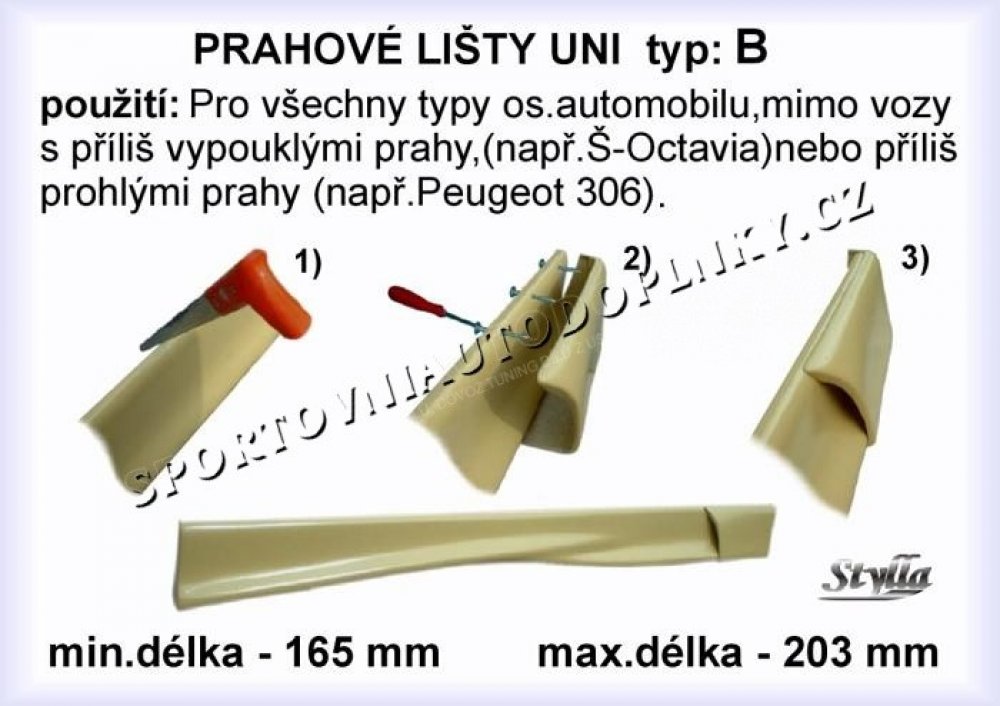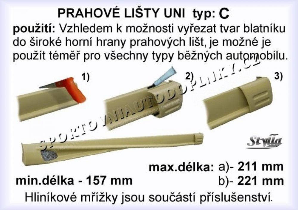 - universální použití, vzhledem k možnosti vyřezat tvar blatníku do široké horní hrany prahových lišt, je možné je použít skoro na všechny typy aut, instalace délky se provádí rozříznutím prahů ve střední části, kde překlenutím pres sebe docílíte vaši požadované dé