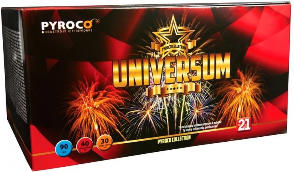 Universum - kompaktní ohňostroj, 90 ran / 20-25 mmKód výrobku: 990REfekt: Multiefektní baterie, rovné a šikmé efekty a silné finále!Počet ran: 90 ran Průměr moždíře: 20 - 25 mmDoba trvání efektu: 45 sec.Rozměry (DxŠxV): 36,5x27x18,5 cmHmotnost pyroslože: 763,2 gTřída nebezpečí: Kategorie F3 - Prodej od 21 let.ADR zařazení: 1,4GVáha: 5,5 kg