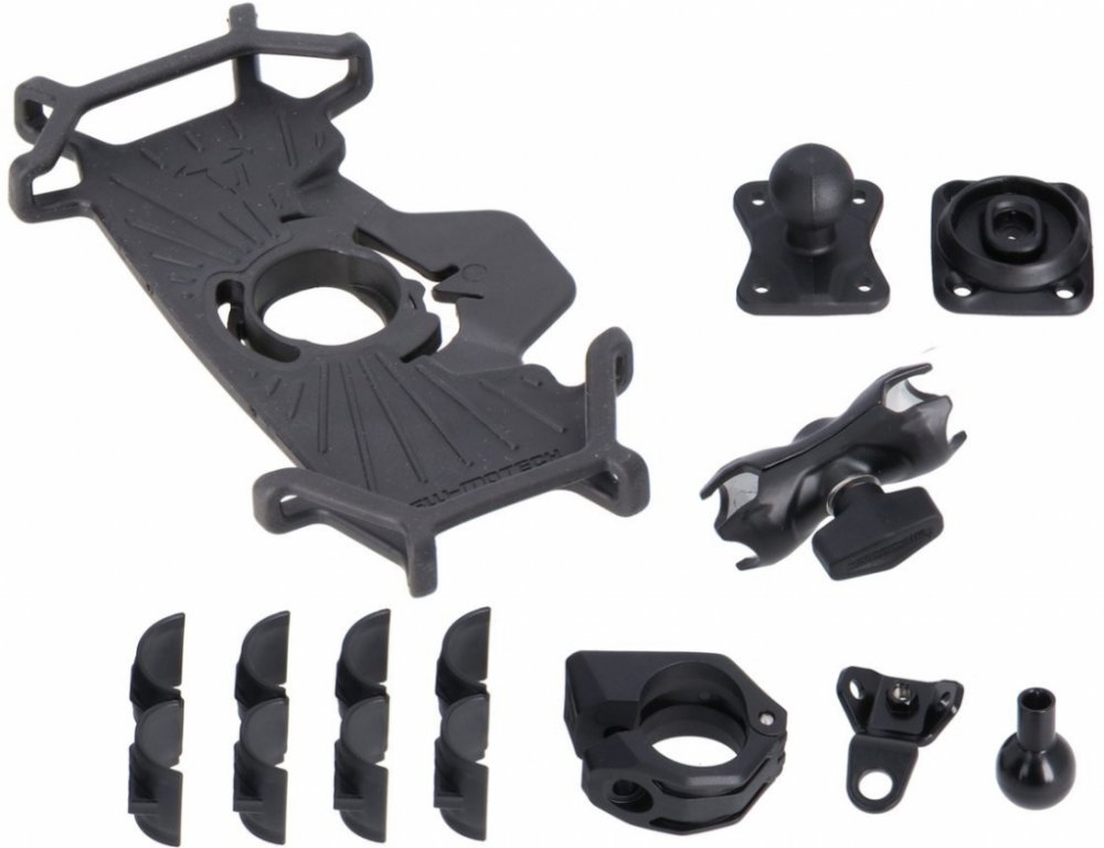 Přiložený držák T-Lock s držákem smartphonu umožňuje rychlé připojení smartphonů k univerzální navigační sadě. Držák T-Lock lze upevnit na upínací rameno o čtvrt otáčky ve směru hodinových ručiček. Silikonové pásky držáku smartphonu umožňují připevnění zařízení různých velikostí s maximálními vnějšími rozměry 165 x 80 x 12 mm a minimálními vnějšími rozměry 144 x 71 x 7 mm