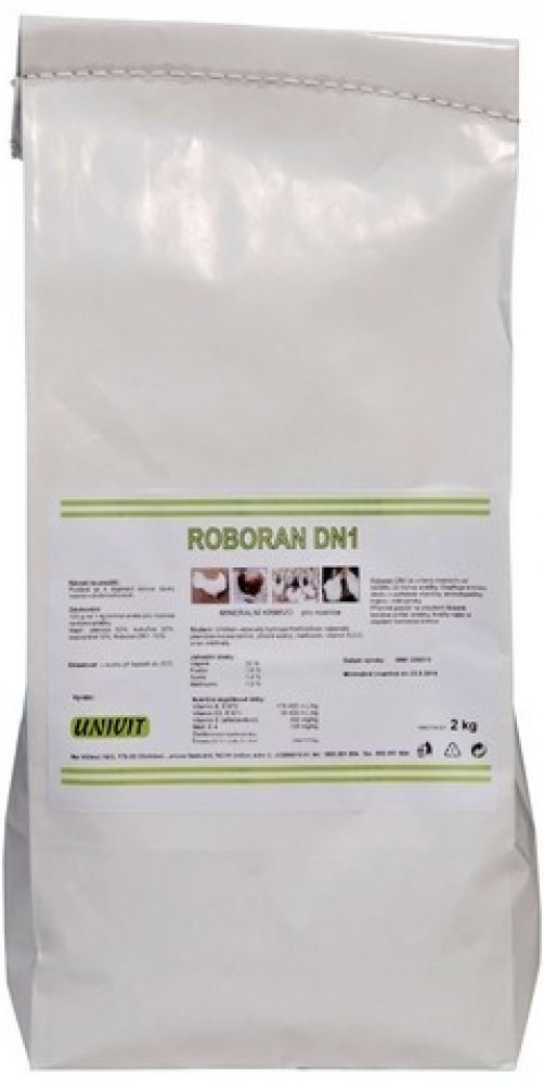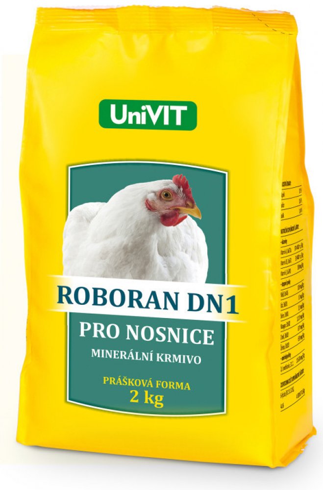 ROBORAN DN1 je vitamino-minerální přípravek do krmiva určený nosnicím od začátku do konce snášky. Doplňuje krmnou dávku o potřebné vitamíny, aminokyseliny methionin a lysin, makro a mikrominerální látky (Fe,Cu,Zn,Mn,J,Co,Se) v optimálních dávkách. Vápník potřebný pro tvorbu vajec je z 60-70 % hrazen přímo z krmiva a z 30-40 % je čerpán z kostí. Fosfor je v krmivech rostlinného původu vázán v solích kyseliny fytové, z níž je drůbeží špatně využíván. Proto je do Roboranu DN1 doplněn enzym fytáza.