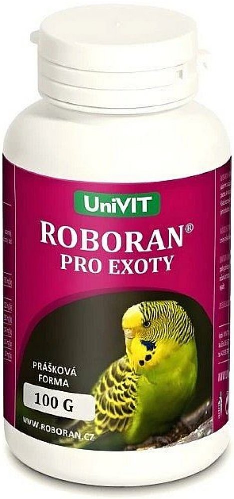 Vitamino-minerální přípravek, který jak složením, tak vzájemným poměrem jednotlivých složek odpovídá potřebám okrasného ptactva. Je vhodný k preventivnímu dietetickému doplnění a biologickému vyvážení neplnohodnotné krmné dávky. Působí na zvýšení odolnosti a ke zlepšení celkové tělesné kondice, hlavně v zimním a jarním období, v období hnízdění a při stresových stavech.Použití:Používá se v krmivu, které ptáci ochotně přijímají (míchanice, kousky ovoce nebo zrniny s několika kapkami oleje smíchané s přípravkem).Dávkování:Nejvhodnější je 1% koncentrace v krmivu po dobu alespoň 4 týdnů, podle potřeby i déle. Při dlouhodobém podávání se může u některých jedinců projevit snížená ochota přijímat přípravek. V takovém případě stačí ROBORAN na týden vysadit. Přípravek je vhodný i pro holuby.Složení:Uhličitan vápenatý, pšeničná mouka, hydrogenfosforečnan vápenatý, vitamíny A, D, E, K3, B1, B6, B12, niacin, vitamíny - pantothenát vápenatý, cholinchlorid, bioptin, stopové prvky- železo, zinek, měď, mangan, kobalt, jód.Deklarované jakostní znaky:Vápník10 %Fosfor5,8 %Sodík0,57 %Vitamín A500 000 m.j./kgVitamín D100 000 m.j./kgVitamín E (alfatokoferol)600 mg/kgMěď150 mg/kgBalení: 100 g