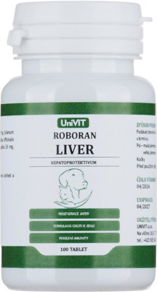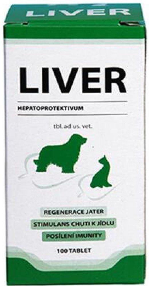 LIVER je schválený veterinární přípravek určený k podpoře fyziologických funkcí jater s detoxikačními a hepatoprotektivními účinky.Je vhodný jako součást léčby infekčních onemocnění jater (infekční hepatitis), chronických jaterních chorob (cirhosis), při otravách, při podávání antibiotik, antiparazitik a dalších léků, při ztrátě chuti k jídlu, při pooperačních stavech a v rekonvalescenci. Stimuluje přirozenou regeneraci jaterního parenchymu,přispívá ke zvýšení syntetických funkcí jater, podporuje syntézu proteinů a tím umožňuje růst a zvýšení tělesné hmotnosti. Obsahuje směs extraktů z bylin, jejichž účinky se vzájemně doplňují a potencují. Tyto účinky jsou prokázány odbornými studiemi. "Žádejte u svého veterinárního lékaře!"