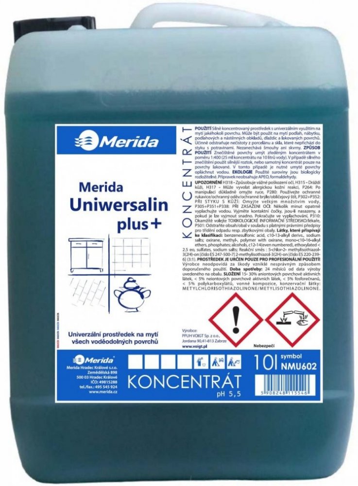 Kód produktu : NMU602 Univerzální prostředek na mytí a ošetřování veškerých povrchů, odolných vůči působení vody. Může se používat na mytí podlah, nábytku, podlahových a nástěnných panelů, kachlíků, a natřených povrchů. Účinně odstraňuje špínu z porcelánu a skla, které nepřichází do styku s potravinami. Neponechává šmouhy ani skvrny. Ředění vodou v poměru až 1 : 400 ( 25 ml koncentrátu na 10 l vod...