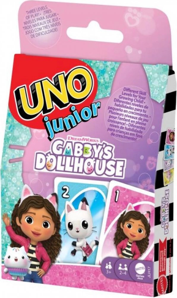 Oblíbená dětská karetní hra UNO Junior v edici Gabby’s Dollhouse přináší barevnou zábavu pro malé hráče. Hraje se podle klasických pravidel UNO – přikládáte karty podle barvy nebo čísla a snažíte se být první bez karet. Edice nabízí 3 úrovně obtížnosti pro různé věkové dovednosti a díky speciálním symbolům na kartách je vhodná i pro hráče s poruchou rozlišování barev.