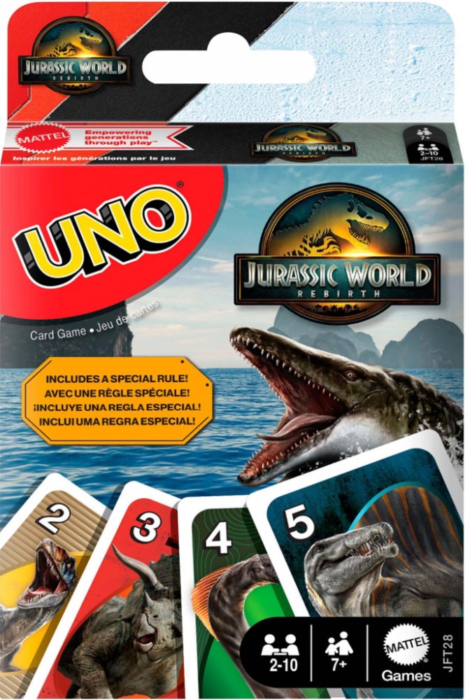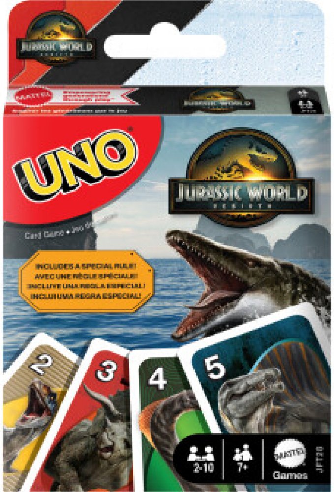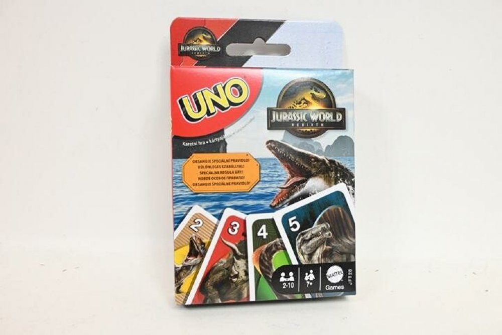 UNO Jurský svět přináší oblíbenou karetní hru v novém, dobrodružném stylu inspirovaném ikonickými obrázky z filmové série Jurský svět. Kromě klasických pravidel obsahuje i speciální kartu, která do hry přináší nový zvrat a ještě více napětí. UNO Jurský svět přináší oblíbenou karetní hru v novém, dobrodružném stylu inspirovaném ikonickými obrázky z filmové série Jurský svět. Kromě klasických pravidel obsahuje i speciální kartu, která do hry přináší nový zvrat a ještě více napětí.