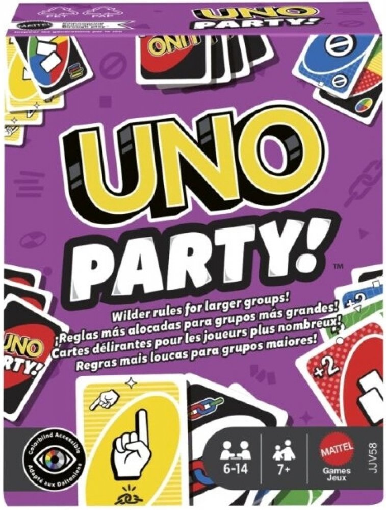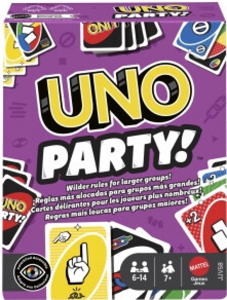 Hledáte Karetní hra Uno Party refresh ? U nás za skvělou cenu 288,00 Kč! Neváhejte a nakupte u profesionálů. Speciální edice oblíbené karetní hry UNO, která se hraje stejně jako klasické UNO® – hledáte karty se stejnou barvou, číslem nebo symbolem. Tato verze je upravena pro větší skupiny hráčů, obsahuje více karet a přináší ještě hlasitější, bláznivější a divočejší zábavu. Nezapomeňte vykřiknout „UNO!“, když vám zbývá poslední karta. Přidává i nová pravidla pro interaktivní hru, například kartu „Ukaž na druhého“, kdy musí každý hráč ukázat na jiného – a ten si lízne kartu. UNO Party obsahuje 168 karet, což odpovídá 1,5 balíčku klasického UNO, a je ideální na každou párty nebo rodinné setkání plné smíchu. Věk 7+