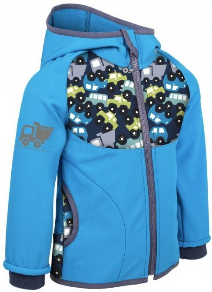 Unuo dětská softshellová bunda s fleecem autíčka tyrkysová