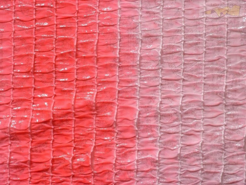 Tento růžový plisé duhovaný úplet s volány je splývavý a vhodný na výrobu letních šatů, triček, sukní, nebo halenek.stříháme klasicky po délce.