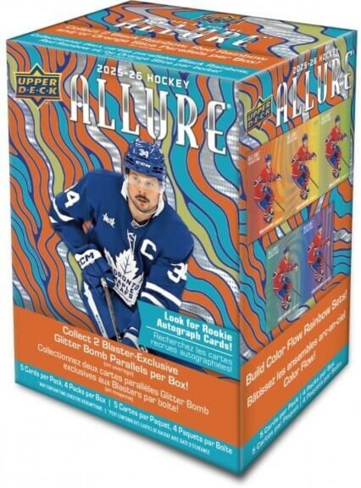 2025-2026 NHL Upper Deck Allure Hockey Blaster Box obsahuje 4 balíčků hokejových karet. V každém balíčku najdete 5 karet. Celkem tak získáte 20 karet.
