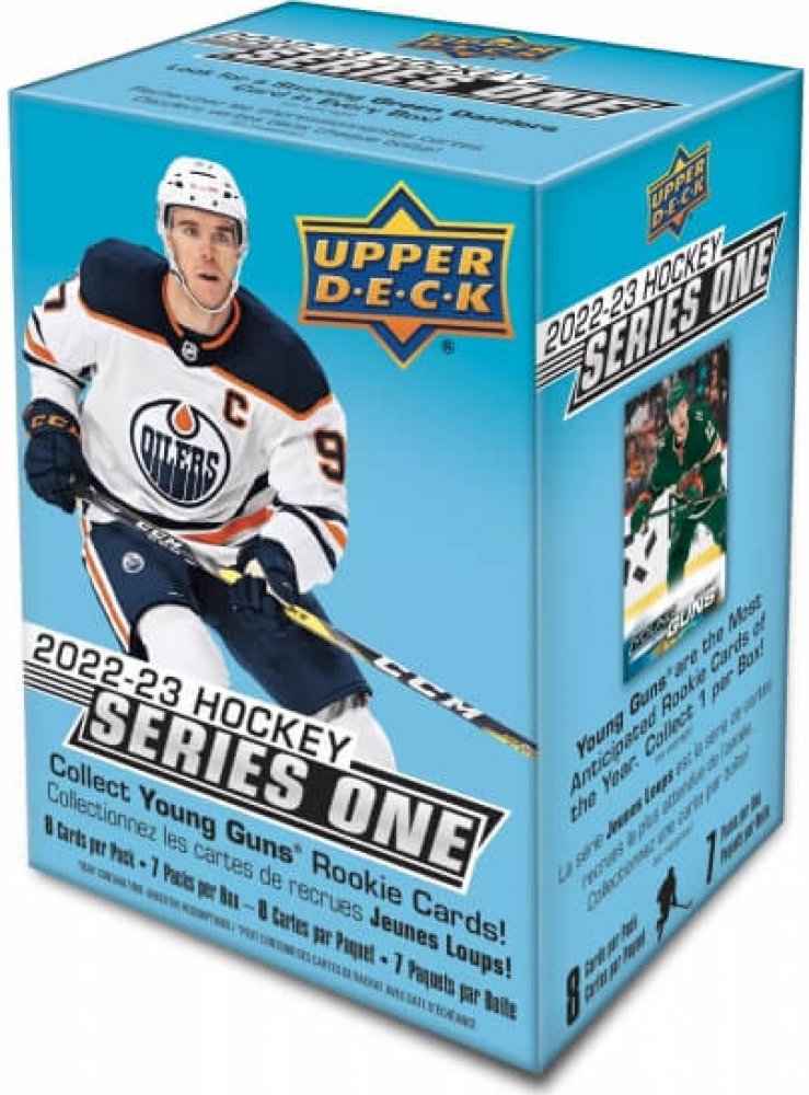 2022-2023 NHL Upper Deck Series One Blaster box obsahuje 7 balíčků po 8 kartách. Blaster obsahuje cennější karty než retail, či gravity feed.