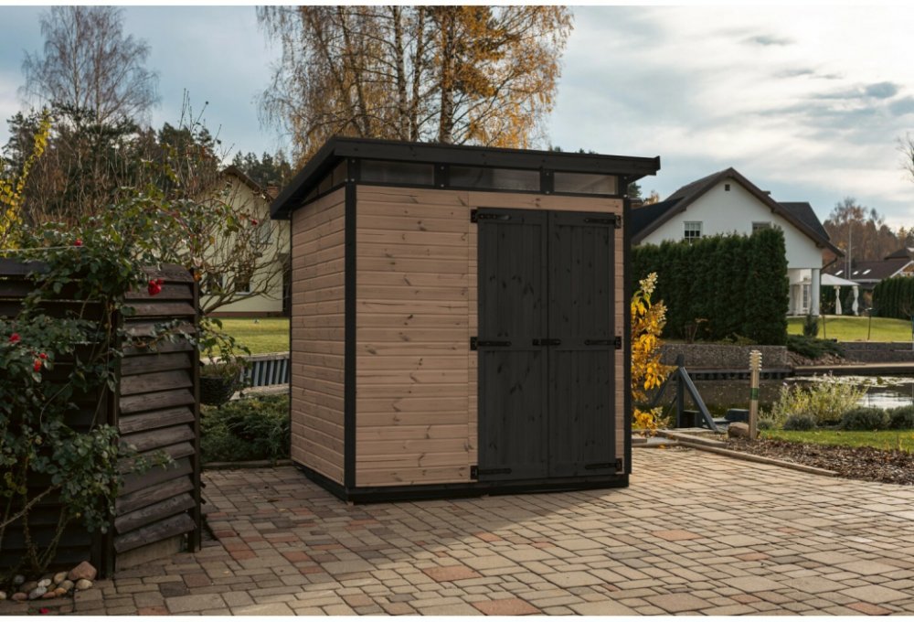 Dřevěné zahradní domky na nářadí Upyard z řady Strongbox nabízí robustní a stylové řešení pro uložení vašeho zahradního nářadí a dalších věcí. S impregnovanými základy a plastovou střechou odolnou proti povětrnostním vlivům budete ideálně vybaveni do každého počasí. Technické parametry - Strongbox L: - Vnitřní plocha: 2,95 m2 - Podlahová plocha: 3,3 m2 - Tloušťka stěny: 15 mm - Výška stěny: 1,85 m - Výška hřebene: 1,9 m Stěny Stěny jsou tvořeny deskami tloušťky 15 mm vyrobenými z dřeva s certifikací FSC, která zaručuje, že dřevo pochází z udržitelného lesního hospodářství. Díky panelové konstrukci je montáž obzvláště rychlá a snadná, takže svůj nový domek můžete okamžitě používat. Dveře a okna Dvoukřídlé dveře umožňují snadné uložení objemných předmětů a zajišťují pohodlný přístup k vašim věcem. Dveře je možné uzamknout visacím zámkem (není součástí balení). Domek nabízí optimální ventilaci důmyslně umístěnými otvory v horní části, které zajišťují výbornou cirkulaci vzduchu a současně chrání vaše věci. Střecha Vysoce kvalitní plastová střecha zajišťuje vynikající ochranu proti povětrnostním vlivům a spolehlivé uložení vašeho majetku za všech podmínek. Základy Zahradní domek je doporučeno postavit na tvrdém a dokonale hladkém povrchu jako je dlažba, beton, dřevěné plošiny apod. Přírodní terén není pro tento typ stavby vhodným povrchem. Při stavbě základů je nutné ponechat vzduchovou mezeru mezi domkem a zemí, aby byla umožněna přirozená cirkulace vzduchu. Pečlivá příprava základu a podlahy zajišťuje dlouhou životnost výrobku. Doporučuje se použít zemní vruty, neboť jsou ekonomické, rychlé a snadno se instalují a lze je použít v různých typech půd. Barvení a impregnace Domek je dostupný v přírodní verzi nebo ve verzi ošetřené z vnější strany barevnou lazurou. Díky lazuře zůstává zachován přírodní vzhled s kresbou dřeva a zahradní domek je chráněn před povětrnostními vlivy. Interiér domku je v přírodní barvě. Domek v přírodní verzi je vyroben z neopracovaného dřeva. K ochraně dřeva se doporučuje použití vhodných barev nebo impregnačních prostředků. Podlahové desky by měly být předem ošetřeny impregnací na dřevo, zejména ze spodní strany, aby byly chráněny před vlhkostí. Doporučuje se také oboustranná impregnace dveří. Pečlivá příprava dřeva zabraňuje pronikání vlhkosti a zajišťuje dlouhou životnost domku. Výrobek je dodáván nesmontovaný.