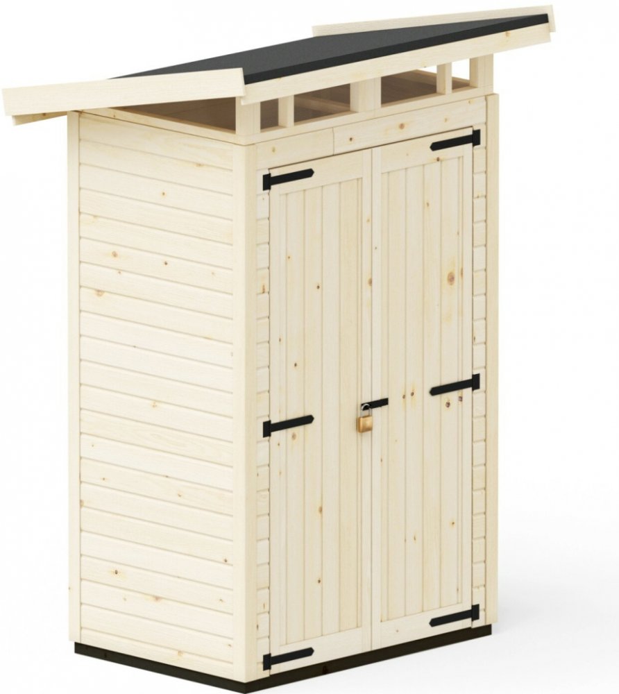 Dřevěné zahradní domky na nářadí Upyard z řady Strongbox nabízí robustní a stylové řešení pro uložení vašeho zahradního nářadí a dalších věcí. S impregnovanými základy a plastovou střechou odolnou proti povětrnostním vlivům budete ideálně vybaveni do každého počasí. Technické parametry - Strongbox S: - Vnitřní plocha: 0,9 m2 - Podlahová plocha: 1,2 m2 - Tloušťka stěny: 15 mm - Výška stěny: 1,85 m - Výška hřebene: 1,9 m Stěny Stěny jsou tvořeny deskami tloušťky 15 mm vyrobenými z dřeva s certifikací FSC, která zaručuje, že dřevo pochází z udržitelného lesního hospodářství. Díky panelové konstrukci je montáž obzvláště rychlá a snadná, takže svůj nový domek můžete okamžitě používat. Dveře a okna Dvoukřídlé dveře umožňují snadné uložení objemných předmětů a zajišťují pohodlný přístup k vašim věcem. Dveře je možné uzamknout visacím zámkem (není součástí balení). Domek nabízí optimální ventilaci důmyslně umístěnými otvory v horní části, které zajišťují výbornou cirkulaci vzduchu a současně chrání vaše věci. Střecha Vysoce kvalitní plastová střecha zajišťuje vynikající ochranu proti povětrnostním vlivům a spolehlivé uložení vašeho majetku za všech podmínek. Základy Zahradní domek je doporučeno postavit na tvrdém a dokonale hladkém povrchu jako je dlažba, beton, dřevěné plošiny apod. Přírodní terén není pro tento typ stavby vhodným povrchem. Při stavbě základů je nutné ponechat vzduchovou mezeru mezi domkem a zemí, aby byla umožněna přirozená cirkulace vzduchu. Pečlivá příprava základu a podlahy zajišťuje dlouhou životnost výrobku. Doporučuje se použít zemní vruty, neboť jsou ekonomické, rychlé a snadno se instalují a lze je použít v různých typech půd. Barvení a impregnace Domek je dostupný v přírodní verzi nebo ve verzi ošetřené z vnější strany barevnou lazurou. Díky lazuře zůstává zachován přírodní vzhled s kresbou dřeva a zahradní domek je chráněn před povětrnostními vlivy. Interiér domku je v přírodní barvě. Domek v přírodní verzi je vyroben z neopracovaného dřeva. K ochraně dřeva se doporučuje použití vhodných barev nebo impregnačních prostředků. Podlahové desky by měly být předem ošetřeny impregnací na dřevo, zejména ze spodní strany, aby byly chráněny před vlhkostí. Doporučuje se také oboustranná impregnace dveří. Pečlivá příprava dřeva zabraňuje pronikání vlhkosti a zajišťuje dlouhou životnost domku. Výrobek je dodáván nesmontovaný.