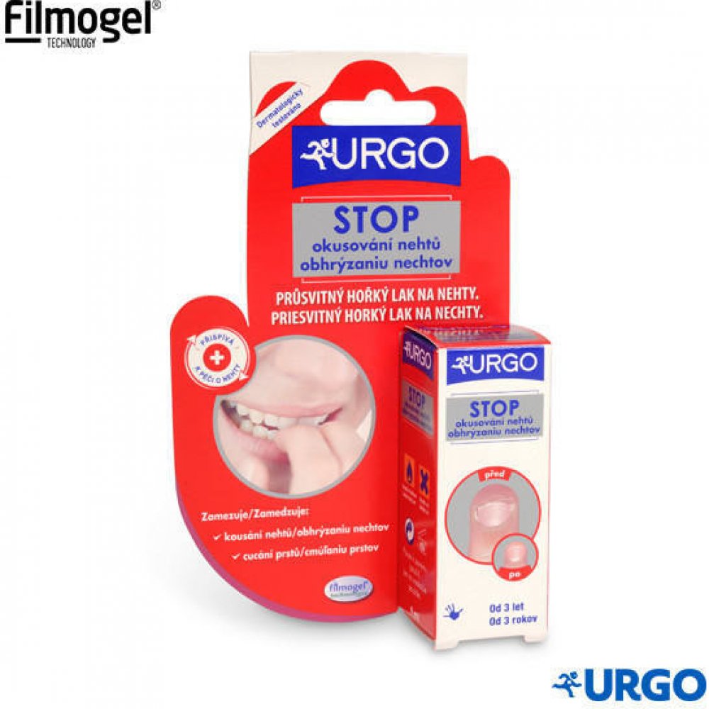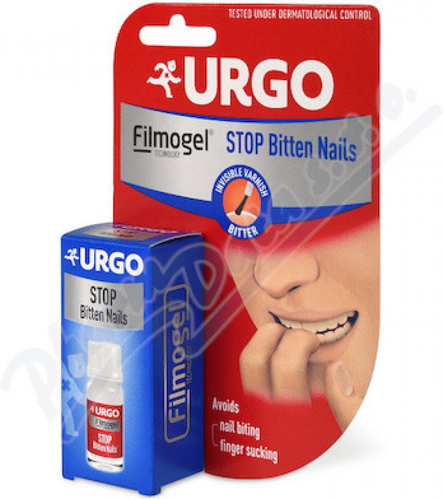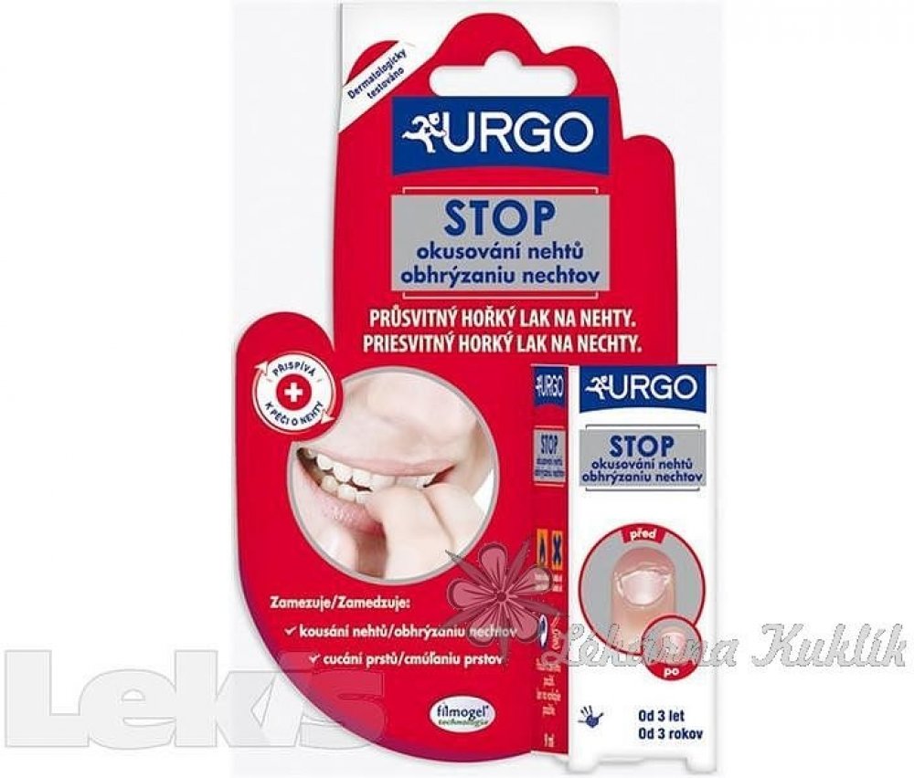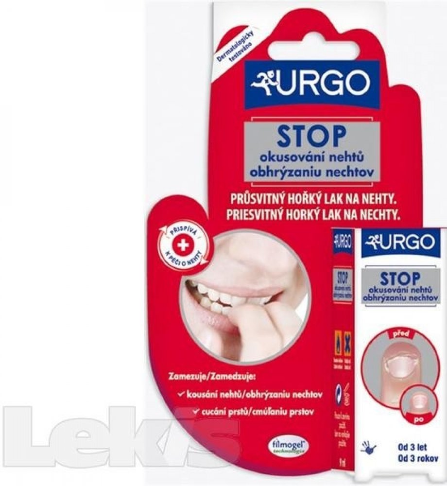 Zamezuje kousání nehtů a cucání prstů. URGO Stop okusování nehtů zamezuje kousání nehtů a cucání prstů. Hořký, průsvitný a nezávadný lak na nehty, který díky své hořké chuti odrazuje od kousání nehtů a cucání prstů, přispívá k péči o nehty.