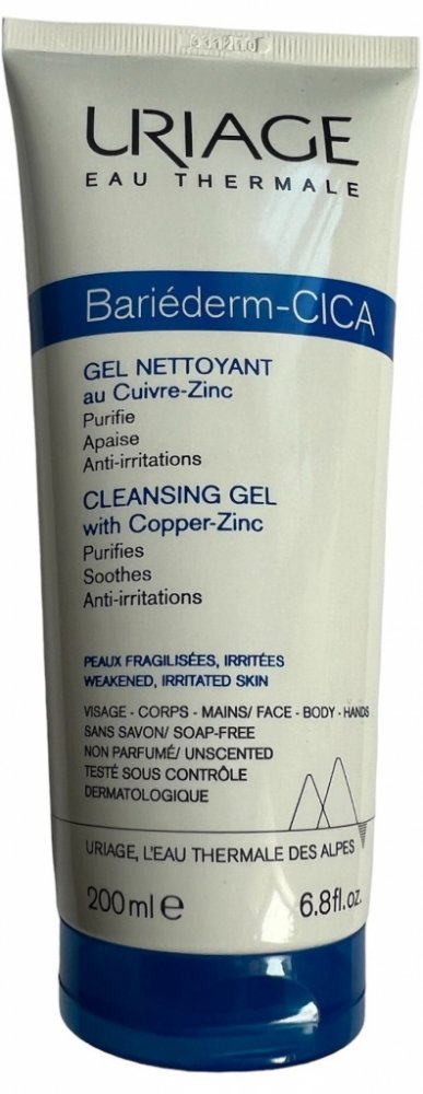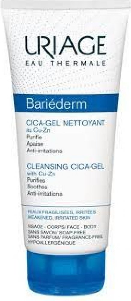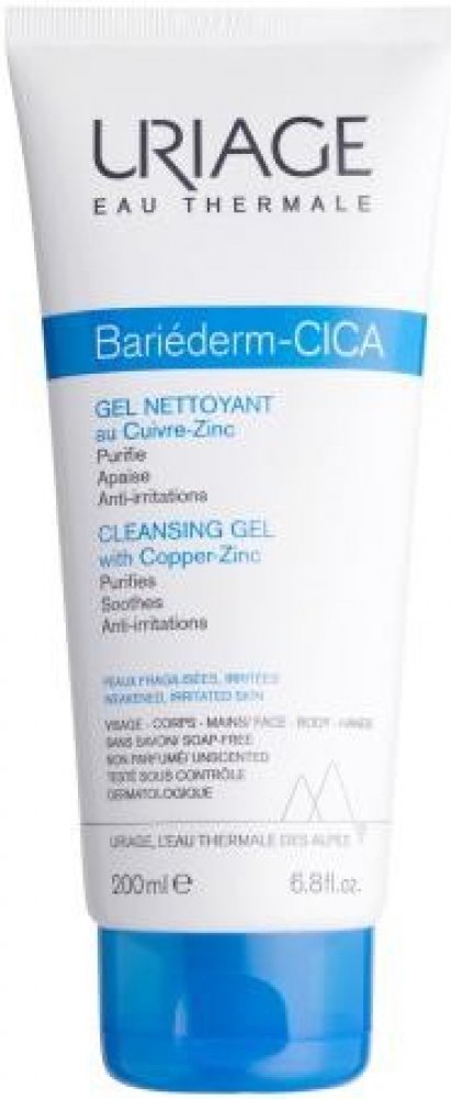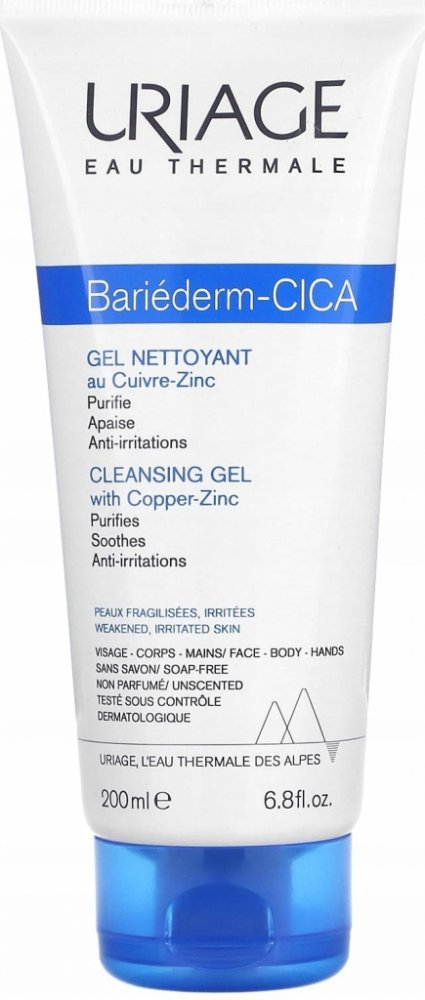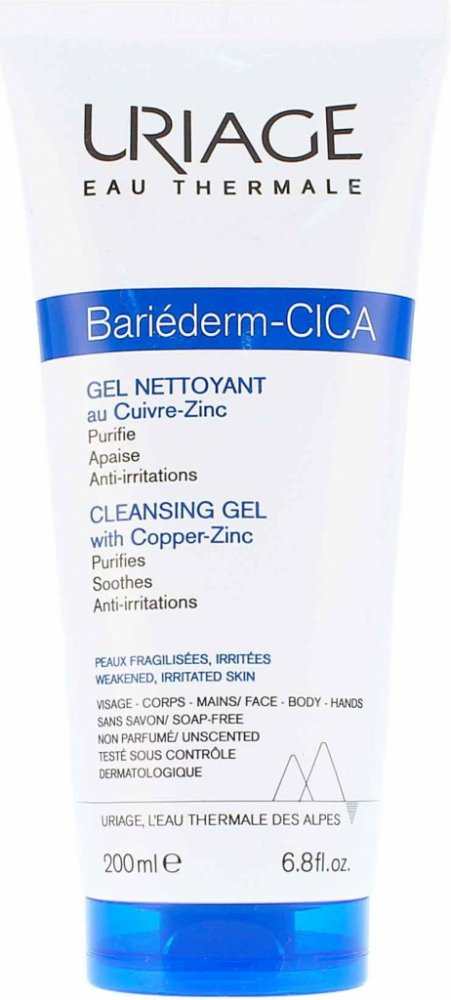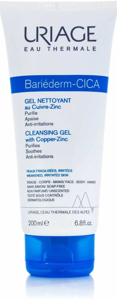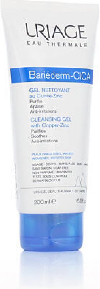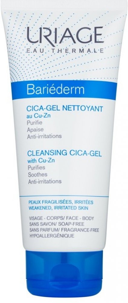 Uriage Bariéderm CICA Čisticí gel s obsahem mědi a zinku na citlivou podrážděnou pokožku, která je náchylná k rozvoji infekce a projevům atopie. Myje bez vysoušení a zklidňuje pokožku. Čisticí báze bez mýdla obsahuje pouze jemné povrchově aktivní látky a zároveň je obohacena o hydratační a vyživující složky.