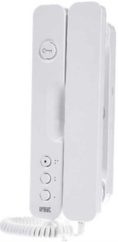 Domovní telefon se 3 servisními tlačítky a 1 LED signalizující vyzvánění a další funkce (např. otevřené dveře). Jedno tlačítko pro volání na ústřednu, jedno pro aktivaci nainstalované servisní funkce (rozsvěcení světel na chodbě, otevírání dveří garáže atd.) a jedno pro funkci automatického otevírání dveří (rychle blikající LED). LED také signalizuje při vypnutém zvonění (pomalé blikání). Trvale pak svítí, jsou-li dveře otevřené. Vlastnosti: Moderní a spolehlivý digitální systém Rozměry (š x V x h): 80 x 225 x 40 mm Barva: bílá Funkce: Tlačítko pro ovládání el. zámku je aktivní od zvednutí sluchátka až do ukončení hovoru. LED pro indikaci - Rychlé blikání: automatické otevírání dveří. Pomalé blikání: vyzvánění deaktivováno. Svítí stále: dveře otevřené (pouze pokud je služba aktivována).