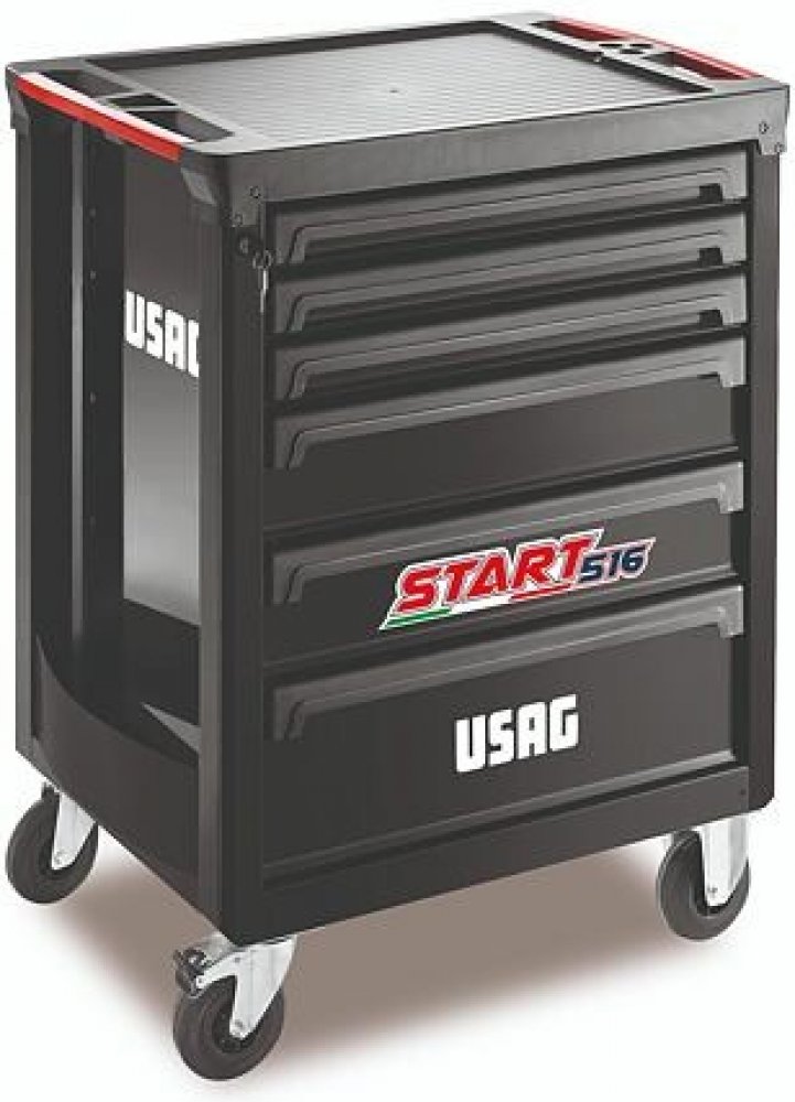 Profesionální montážní dílenský vozík na nářadí USAG řady START. 6 zásuvek integrovaný systém jištění proti samovolnému otevření zásuvek centrální zamykání odolná hliníková pracovní plocha boční držák na spreje dvojité zabudované rukojetě pro vynikající ovladatelnost pryžová kolečka odolná vůči oleje (Ø 125 mm) černá barva RAL 9005 USAG 516 ST6NV je konstrukčně velmi kvalitní dílenský montážní vozík na nářadí pro Vaše každodenní profesionální využití a s dlouhou životností. Ideální volba pro profesionální práci. 6 zásuvek různé výšky (3x 60 mm, 2x 130 mm, 1x 200 mm, zcela oteviratelné na teleskopických pojezdech, velký ložný prostor, maximální zatížení 40 kg na zásuvku). Zásuvky výšky 60 mm a 130 mm jsou ideální pro moduly (kazety) s profesionálním nářadím USAG. Zásuvka výšky 200 mm je ideální pro uskladnění spíše rozměrnějšího kusového nářadí. Velikost zásuvek je optimalizována na 1, 2 nebo 3 moduly (kazety) s profi nářadím USAG, čímž je zajištěno maximální využití místa a přehlednost uloženého nářadí. Integrovaný zajišťovací systém proti samovolnému otevření zásuvek, centrální bezpečnostní zamykání vozíku. Velmi kvalitní a robustní konstrukce ocelové skříně vozíku, proti nárazům odolná pracovní plocha z ABS plastu (maximální zatížení 800 kg), okraje pracovní desky zabraňující pádu malých dílů, boční držák na spreje, ocelové rukojetě pro snadnou manipulaci s vozíkem. Vozík na 4 kvalitních pryžových kolečkách o průměru 125 mm (2x otočná, odolná proti oleji, brzda). Vozík lze při objednání nebo i dodatečně doplnit o profesionální ruční nářadí USAG (moduly - kazety sestav profi nářadí USAG dle skutečné potřeby uživatele). Zavolejte nám, rádi Vám poradíme optimální nejprodávanější sestavy profi nářadí USAG.