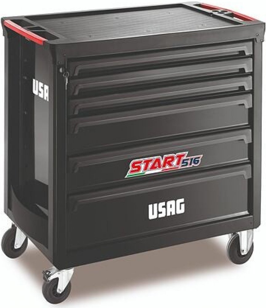 Profesionální montážní dílenský vozík na nářadí USAG řady START XL. 6 zásuvek integrovaný systém jištění proti samovolnému otevření zásuvek centrální zamykání odolná hliníková pracovní plocha boční držák na spreje dvojité zabudované rukojetě pro vynikající ovladatelnost pryžová kolečka odolná vůči oleje (Ø 125 mm) černá barva RAL 9005 USAG 516 STXL6NV je konstrukčně velmi kvalitní dílenský montážní vozík na nářadí pro Vaše každodenní profesionální využití a s dlouhou životností. Ideální volba pro profesionální práci. 6 zásuvek různé výšky (3x 60 mm, 2x 130 mm, 1x 200 mm, zcela oteviratelné na teleskopických pojezdech, velký ložný prostor, maximální zatížení 40 kg na zásuvku). Zásuvky výšky 60 mm a 130 mm jsou ideální pro moduly (kazety) s profesionálním nářadím USAG. Zásuvka výšky 200 mm je ideální pro uskladnění spíše rozměrnějšího kusového nářadí. Velikost zásuvek je optimalizována na 1, 2 nebo 3 moduly (kazety) s profi nářadím USAG, čímž je zajištěno maximální využití místa a přehlednost uloženého nářadí. Rozměr zásuvky je 570 x 420 mm. Integrovaný zajišťovací systém proti samovolnému otevření zásuvek, centrální bezpečnostní zamykání vozíku. Velmi kvalitní a robustní konstrukce ocelové skříně vozíku, proti nárazům odolná pracovní plocha z ABS plastu (maximální zatížení 800 kg), okraje pracovní desky zabraňující pádu malých dílů, boční držák na spreje, ocelové rukojetě pro snadnou manipulaci s vozíkem. Vozík na 4 kvalitních pryžových kolečkách o průměru 125 mm (2x otočná, odolná proti oleji, brzda). Zavolejte nám, rádi Vám poradíme optimální nejprodávanější sestavy profi nářadí USAG.