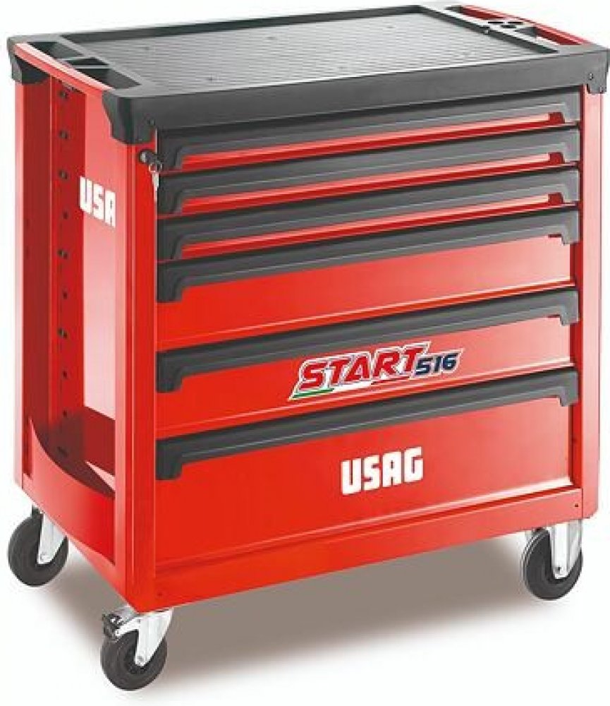 Profesionální montážní dílenský vozík na nářadí USAG řady START XL. 6 zásuvek integrovaný systém jištění proti samovolnému otevření zásuvek centrální zamykání odolná hliníková pracovní plocha boční držák na spreje dvojité zabudované rukojetě pro vynikající ovladatelnost pryžová kolečka odolná vůči oleje (Ø 125 mm) červená barva RAL 3020 USAG 516 STXL6V je konstrukčně velmi kvalitní dílenský montážní vozík na nářadí pro Vaše každodenní profesionální využití a s dlouhou životností. Ideální volba pro profesionální práci. 6 zásuvek různé výšky (3x 60 mm, 2x 130 mm, 1x 200 mm, zcela oteviratelné na teleskopických pojezdech, velký ložný prostor, maximální zatížení 40 kg na zásuvku). Zásuvky výšky 60 mm a 130 mm jsou ideální pro moduly (kazety) s profesionálním nářadím USAG. Zásuvka výšky 200 mm je ideální pro uskladnění spíše rozměrnějšího kusového nářadí. Velikost zásuvek je optimalizována na 1, 2 nebo 3 moduly (kazety) s profi nářadím USAG, čímž je zajištěno maximální využití místa a přehlednost uloženého nářadí. Rozměr zásuvky je 570 x 420 mm. Integrovaný zajišťovací systém proti samovolnému otevření zásuvek, centrální bezpečnostní zamykání vozíku. Velmi kvalitní a robustní konstrukce ocelové skříně vozíku, proti nárazům odolná pracovní plocha z ABS plastu (maximální zatížení 800 kg), okraje pracovní desky zabraňující pádu malých dílů, boční držák na spreje, ocelové rukojetě pro snadnou manipulaci s vozíkem. Vozík na 4 kvalitních pryžových kolečkách o průměru 125 mm (2x otočná, odolná proti oleji, brzda). Zavolejte nám, rádi Vám poradíme optimální nejprodávanější sestavy profi nářadí USAG.