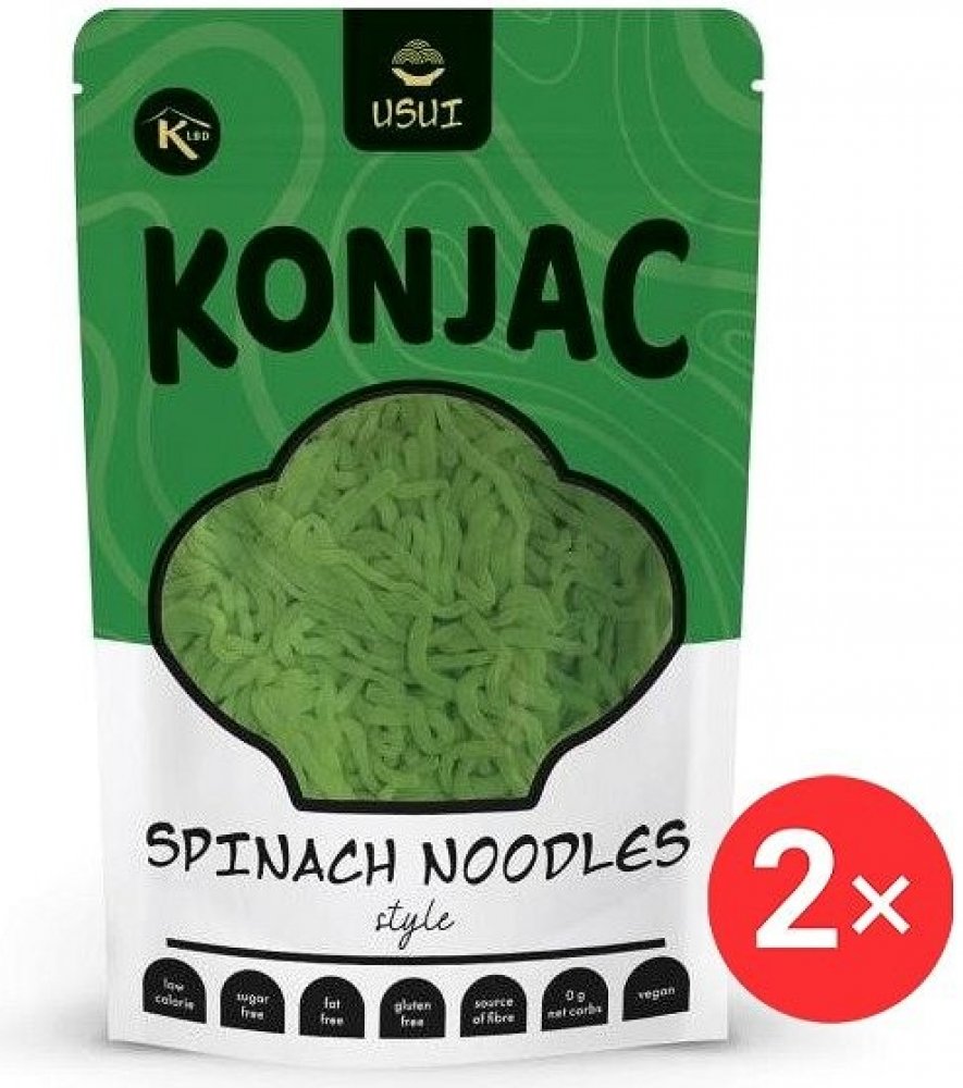Konjakové nudle se špenátem bez sacharidů Usui2× 270 gKonjacové nudle se špenátem USUI představují alternativu k běžným těstovinám. Ve 100 g ukrývají pouze 38 kJ a neobsahují sacharidy ani téměř žádný tuk. Nabízí neutrální chuť. Pro vegany i celiakyKonjakové nudle se špenátem bez sacharidů Usui jsou vhodné pro sportovce, vegany, celiaky i osoby držící keto dietu. Jsou okamžitě připravené ke konzum...