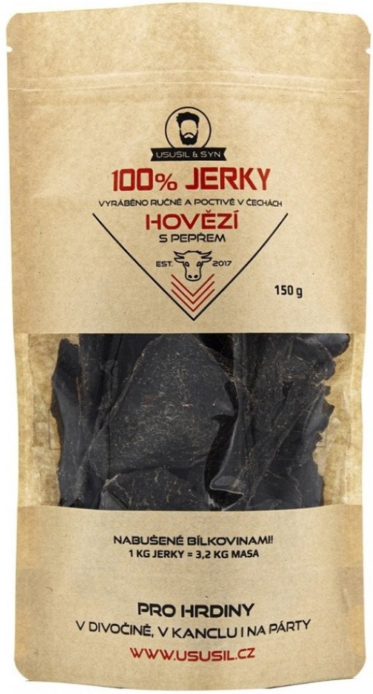 Sušené maso - Usušil & syn 100% hovězí jerky s pepřem - 150g - vyrobeno z nejlepšího českého hovězího masa - žádná chemie, barviva - obsahuje velké množství bílkovin - zdravá a rychlá svač. Sušené maso - Usušil & syn 100% hovězí jerky s pepřem - 150g