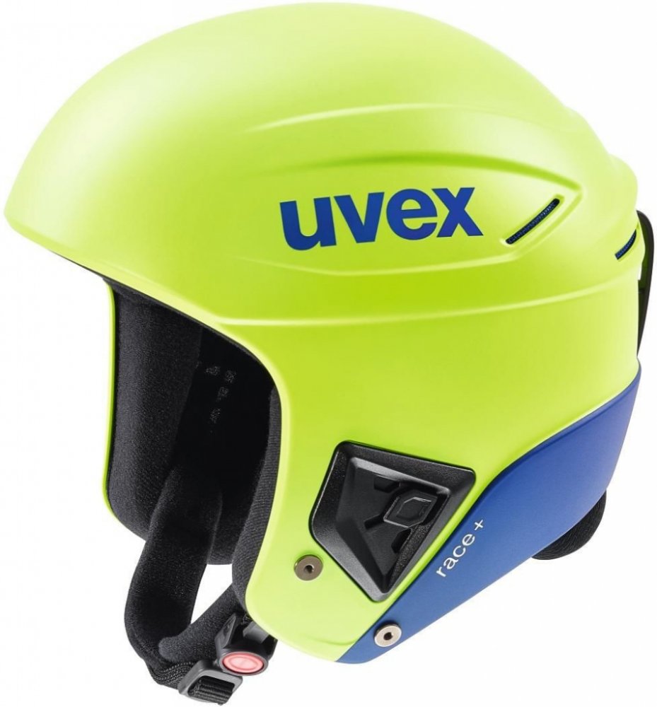 Helma UVEX 9/0 RACE+ 56-57 WH BLU Uvex Race+ je ultra lehká lyžařská helma s ochranou brady vyrobená kombinací +Technologie a Hardshell technologie. Jedná se o spojení extrémně odolného, zároveň velmi lehkého vnějšího pláště vyrobeného ze speciálního termoplastického plastu a vnitřního pláště absorbujícího nárazy. Na sjezdovce jste tak maximálně chráněni. Helma je vybavena komfortním systémem Mono...