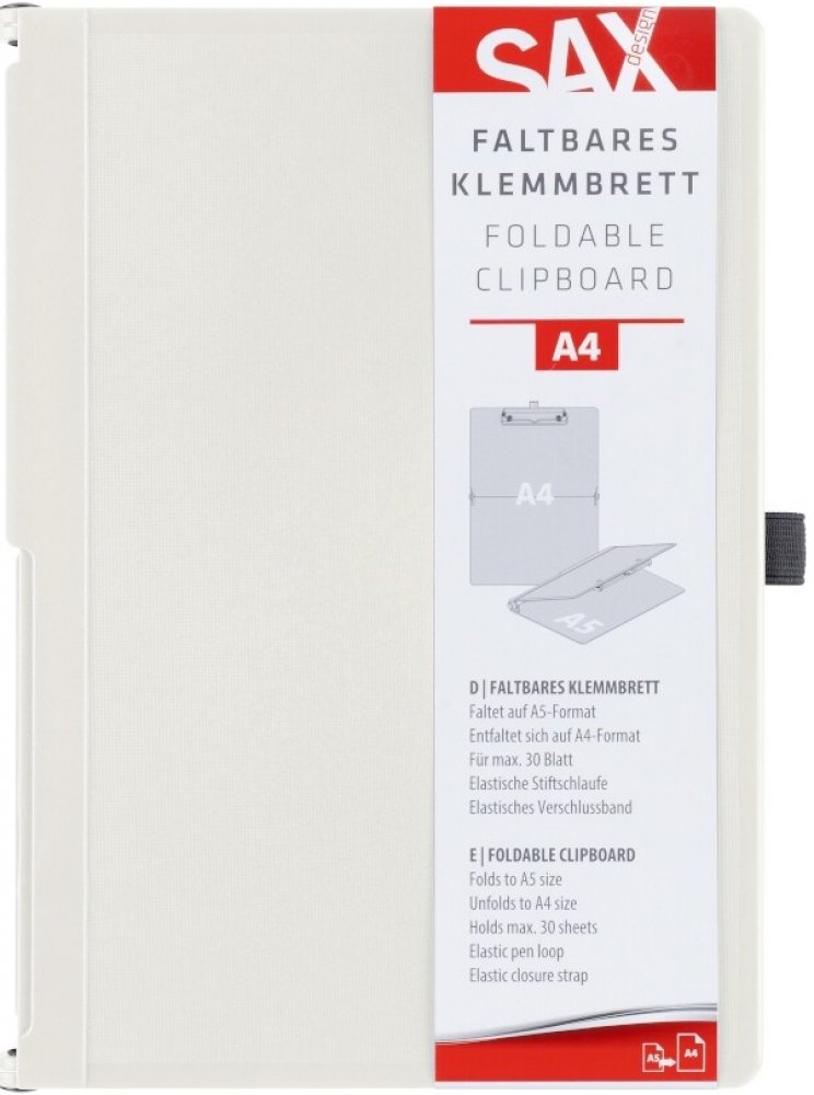 Pevné plastové desky formátu A4 s možností složení do formátu A5. Využitelné v nejrůznějších provozech od výroby přes zdravotnictví až po školství. Pevný materiál umožní horizontální i vertikální psaní. Klip spolehlivě udrží až 30 listů papírů gramáže 80 g/m2. Listy lze ve spodní části zafixovat pevným gumovým páskem, který umožní případně i vnější pevné uzavření desek při více než 5 listech. Elastické textilní očko pro připevnění pera. Prodloužená záruka 5 let. Oceněno Golden Pin Design Award. Rozměry v rozloženém stavu: 23,0 x 31,8 x 1,6 cm; rozměry ve složeném stavu: 23,0 x 16,5 x 2,0 cm.